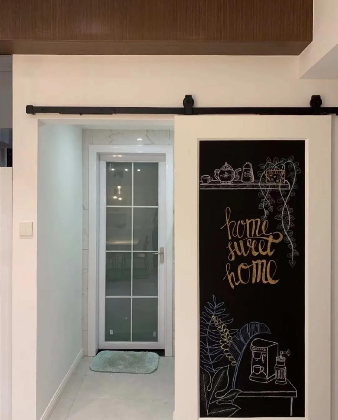 由于卫生间正对着餐厅,所以用谷仓门做了一个隔断,刷上黑板漆,描绘出对美好生活的期许。