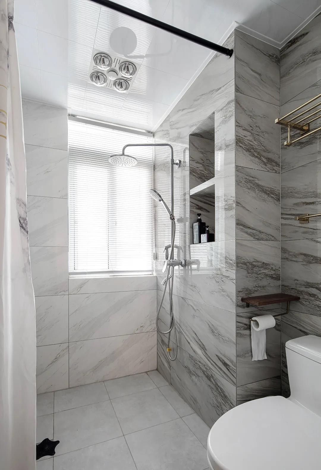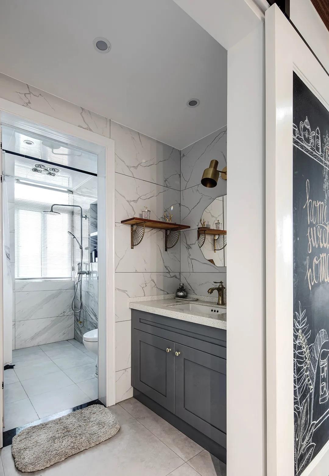 卫生间内部采用了灰色大理石纹的墙地面,简单的搭配经久耐看,又相对耐脏好打理。淋浴间的空间很大,给宝宝洗澡的时候同时容纳下三人也不会拥挤。