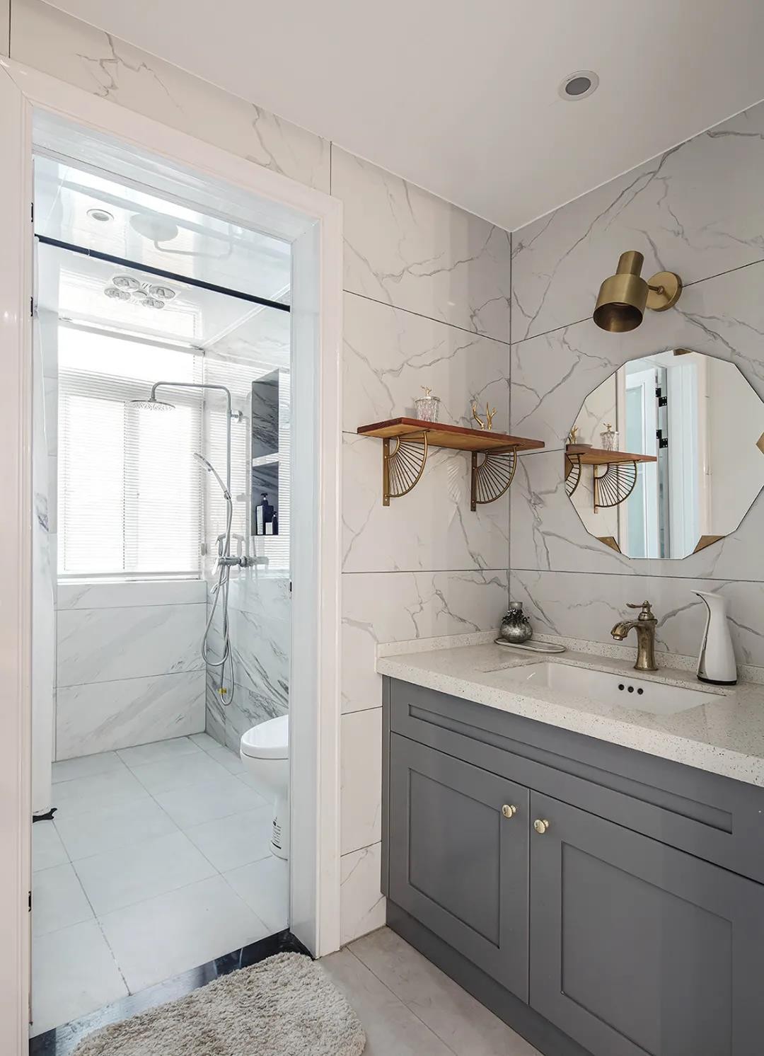 干区的浴室柜采用了典雅的灰色,搭配黄铜质感的五金和壁灯,平添了几分精致感。台下盆的实用性更强,不用担心水溅出来,也杜绝了卫生死角。