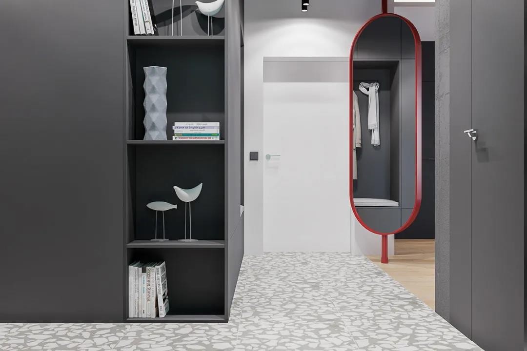 玄关区域以大颗粒的水磨石质感地面,装一面创意椭圆的镜子,结合灰色定制收纳展示柜,摆上精致的小饰品、书籍,让空间感充满端庄优雅的气质。