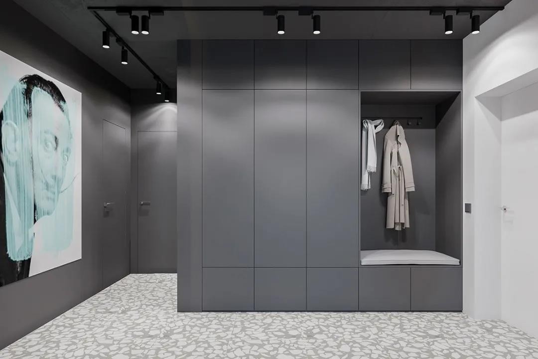 在这个空间的天花做成深灰色的,加入黑色导轨灯,侧边还挂一幅艺术范的装饰画,也让整个空间显得更加***艺术。在收纳柜中间加入一个换鞋凳的位置,也提升了空间的实用与舒适设计
