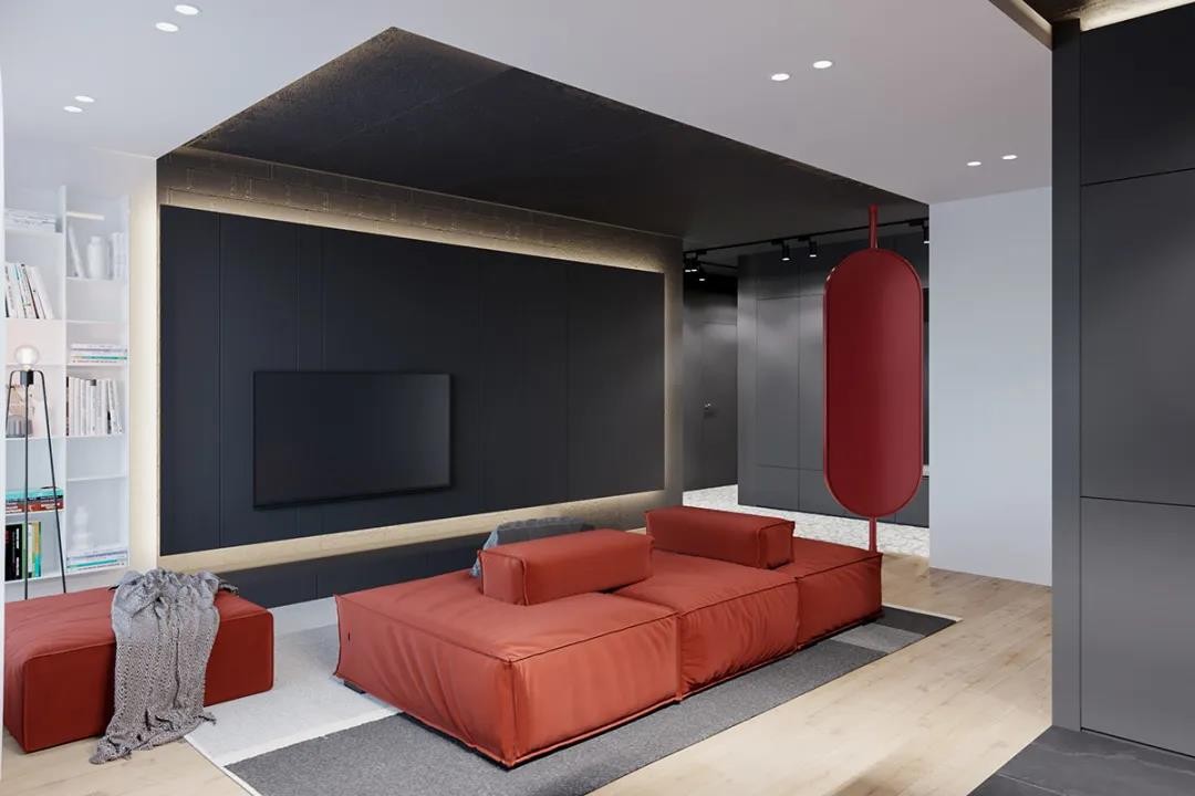 客厅铺上地毯,在中间区域摆一套红色布艺沙发,而造型镜子背后也是红色材质,结合深灰色电视柜与天花,也让空间显得更加稳重端庄而优雅。