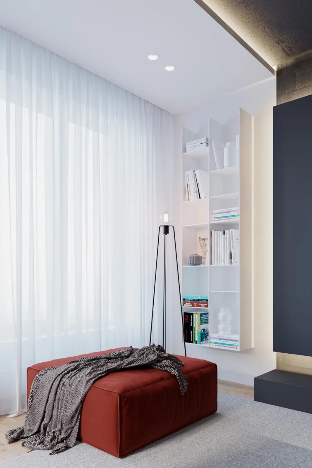 临窗定制的悬空书桌,书桌右侧还加入了一个书架设计,整个空间的设计实用舒适而***。