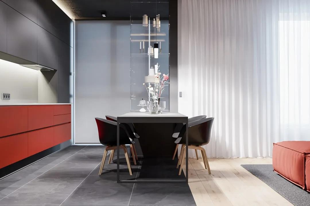 餐厅在客厅沙发后方,在深灰色墙面与收纳柜的背景墙,搭配红色的橱柜,也让空间在冷热之间的色彩冲击下,显得更加时尚***而优雅。