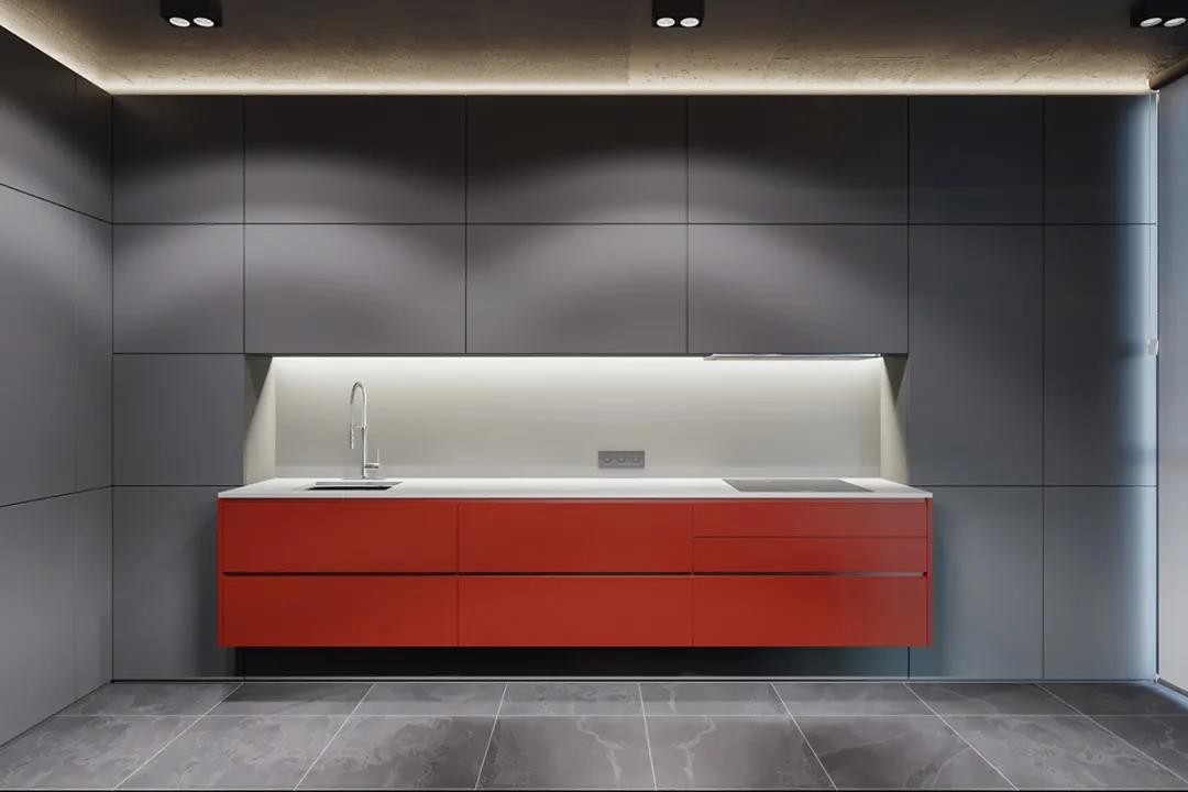 橱柜采取半突出的设计,橱柜部分是红色的材质,天花、吊柜底部都加入暗藏灯带,无主灯的设计也让空间更加现代***。
