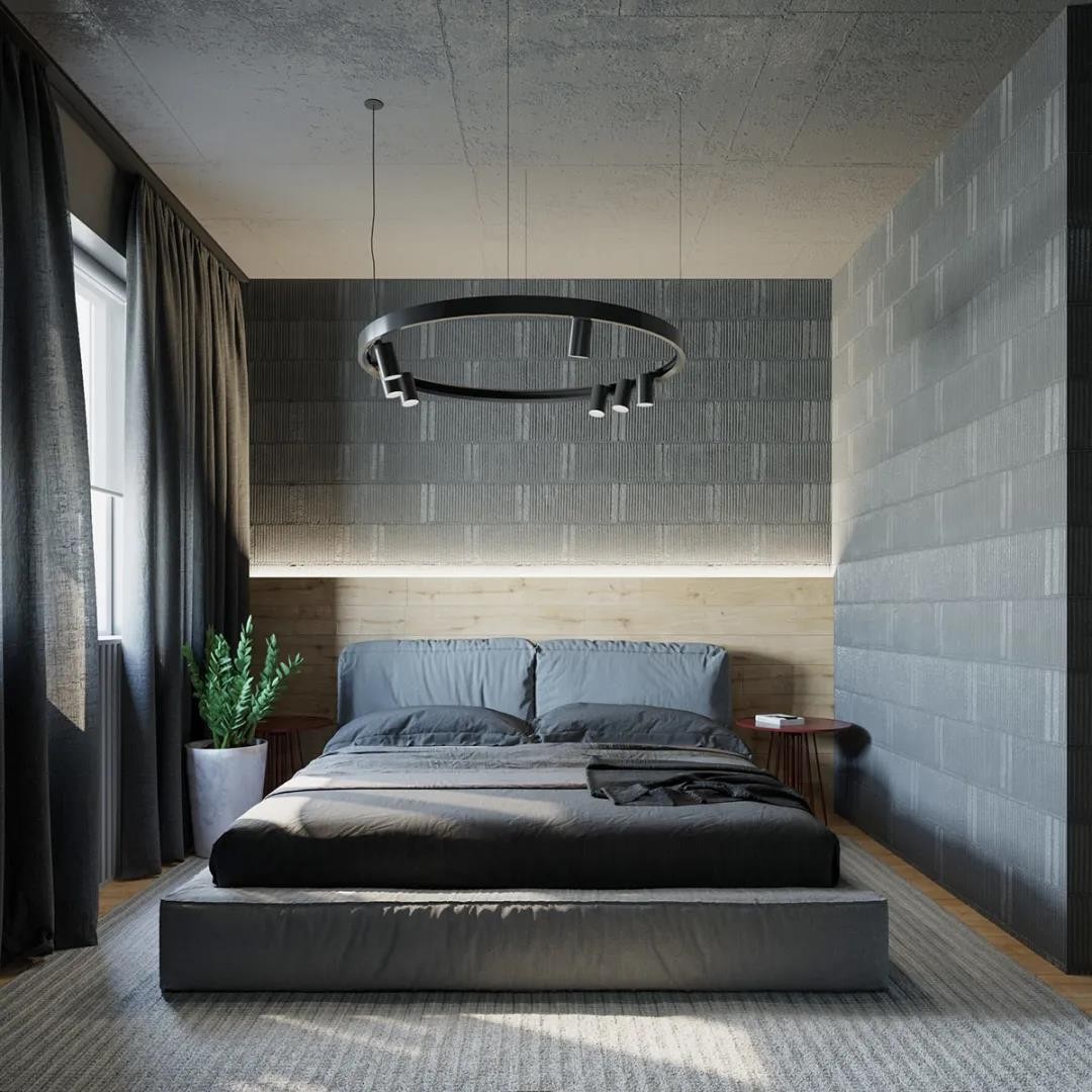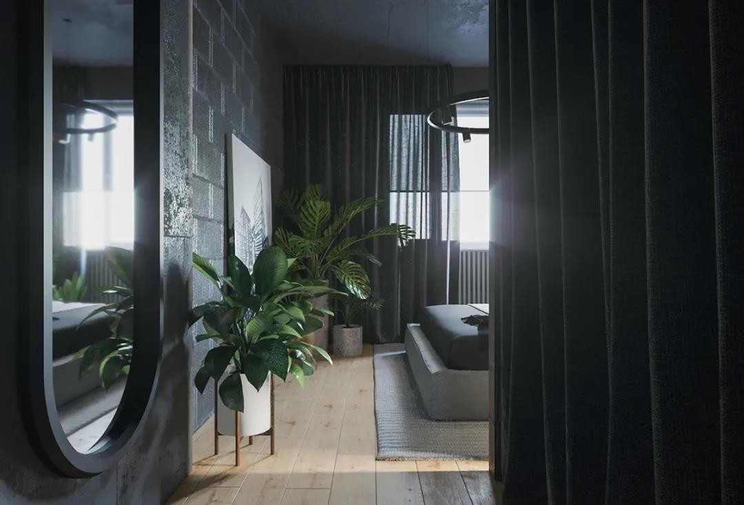 卧室角落位置的绿植盆栽布置,也为***灰的空间带来了一丝生机与活力气息。