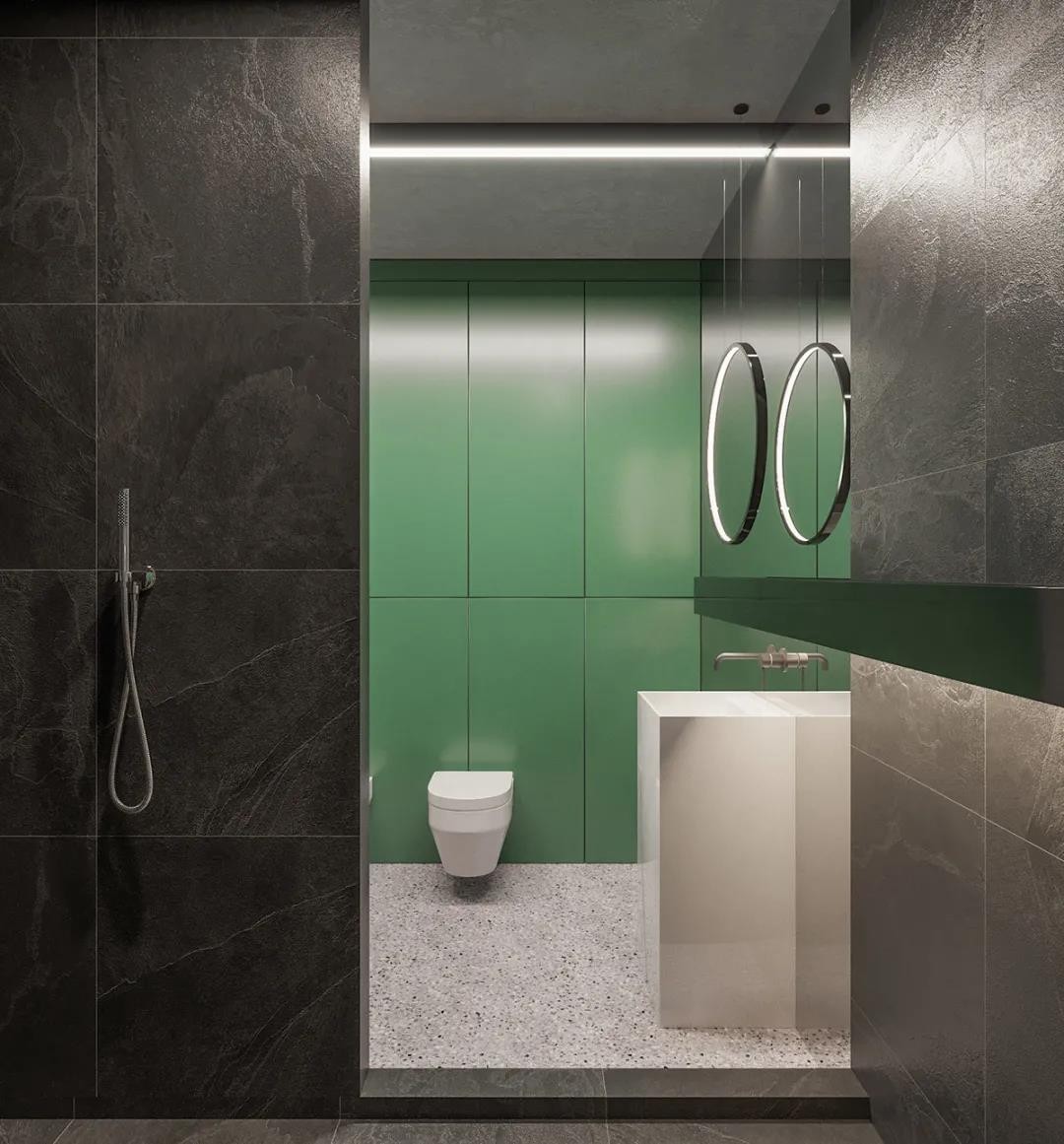 卫生间的地面以水磨石地砖为主,淋浴区的墙面是灰色墙砖,马桶区域的是绿色定制墙板加入大尺寸的镜子、线性的嵌入灯带,也让空间显得极简而舒适大气。