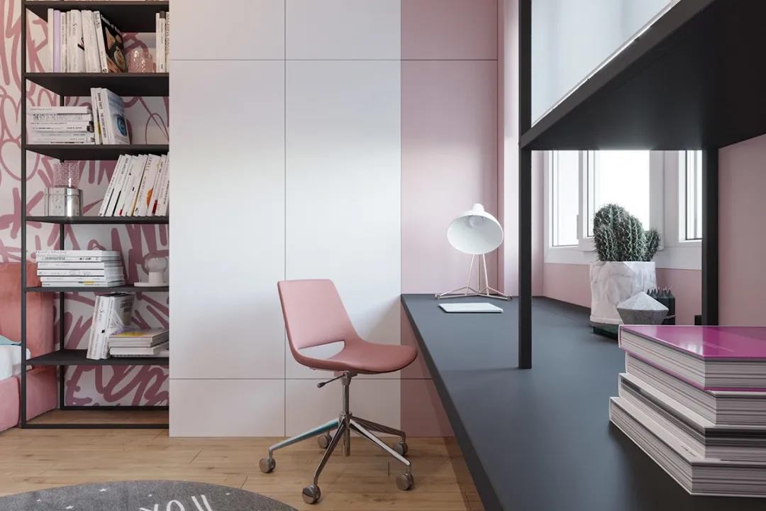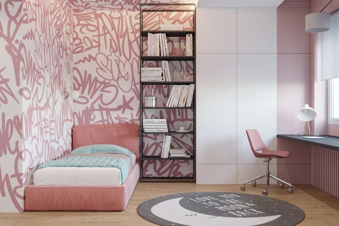 粉色调为主的儿童房,加入粉色床、床侧边的墙面是字母线条拼出来的抽象图形,还有一面通顶的收纳书架+衣柜的组合设计,靠窗布置书桌,也为小女孩提供了一个休息与学习的方便空间。
