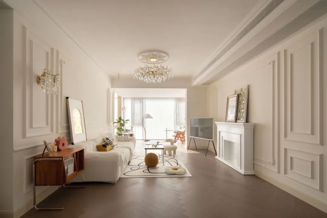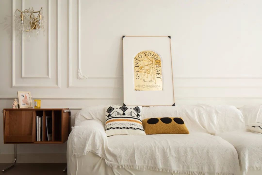 欧式边框造型的沙发墙,摆上简洁朴素的沙发,沙发旁边还有一个小柜子充当边几与书柜功能,搭配上精致的软装细节,让空间显得优雅而简洁大气。