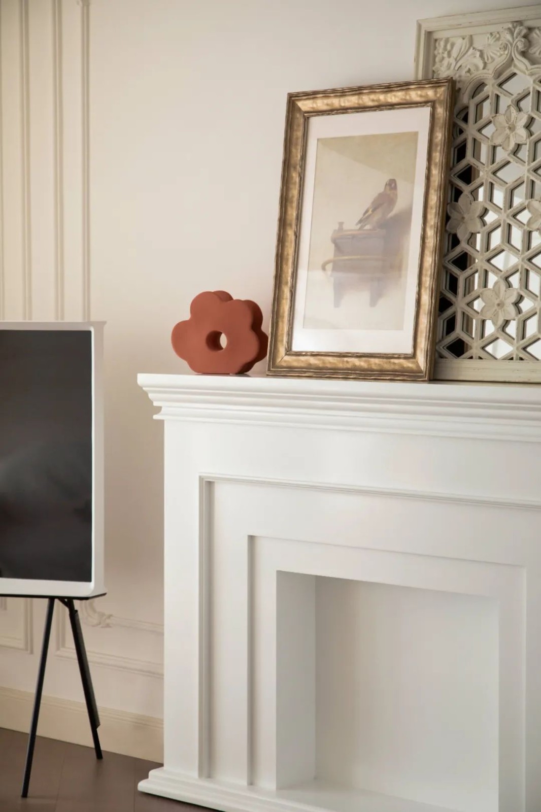 电视墙在边框造型的墙面基础,在中间加入一个壁炉造型,并在壁炉上方布置上装饰画,而电视机则是采取落地支架的布置,带来一种简洁优雅而***华丽的氛围。