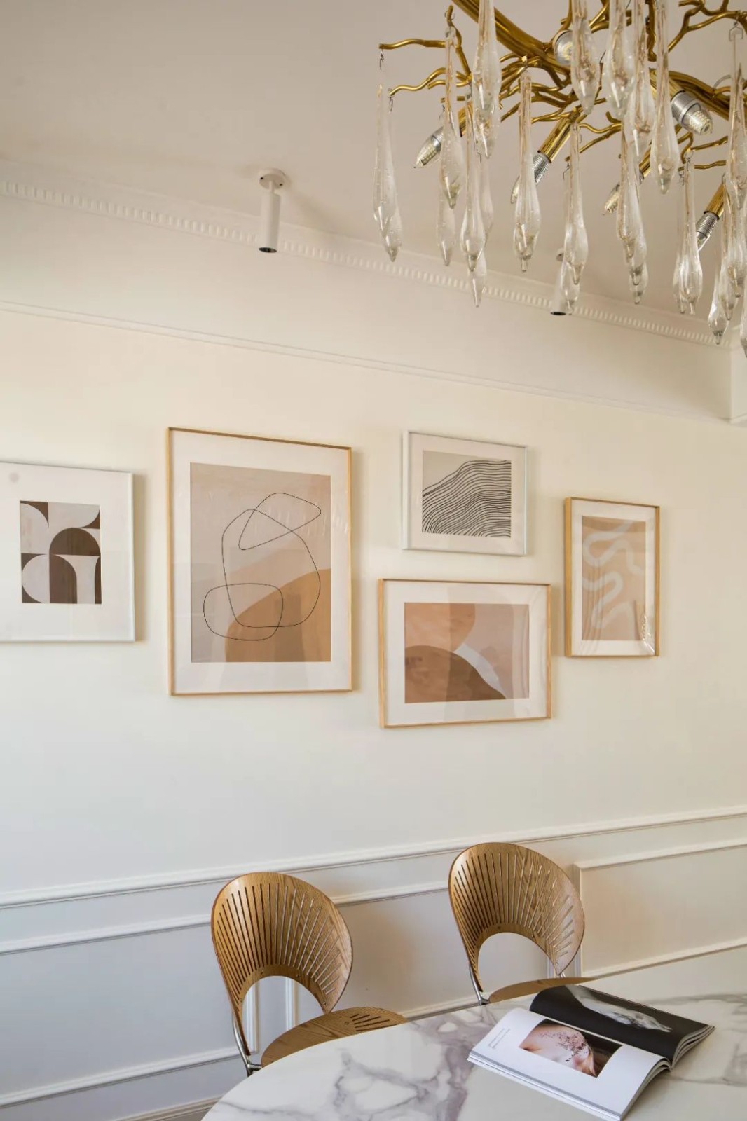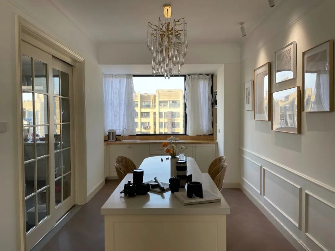 餐桌椅挨着中岛台布置,后方餐厅背景墙挂一组照片墙挂画,中岛台上布置茶具与花瓶,使得用餐充满实用雅致的气质。