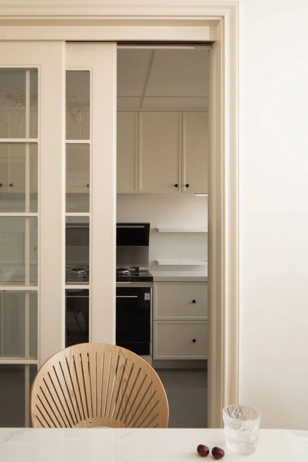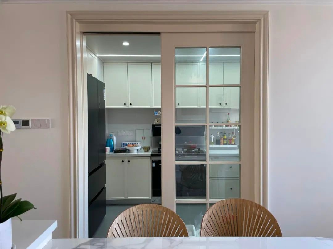 厨房以象牙白色门框的玻璃推拉门,里面定制白色的橱柜吊柜,加上集成灶的设计,为主人提供了一个简洁优雅的烹饪环境。