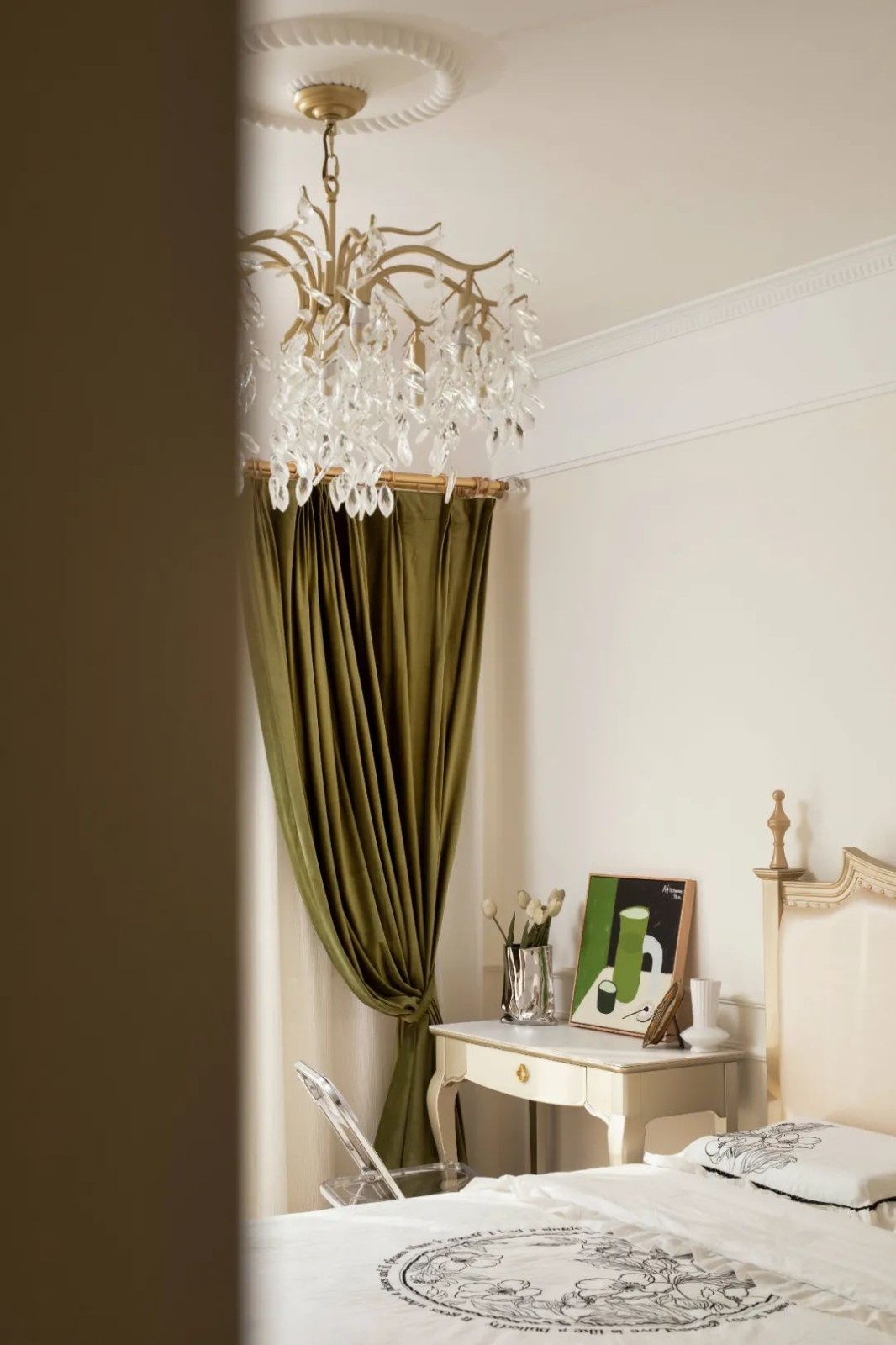 卧室在米白色的空间基调下,装上茶绿色的窗帘,布置带有布艺靠背的床铺,使得整个卧室都显得现代舒适而轻松惬意。