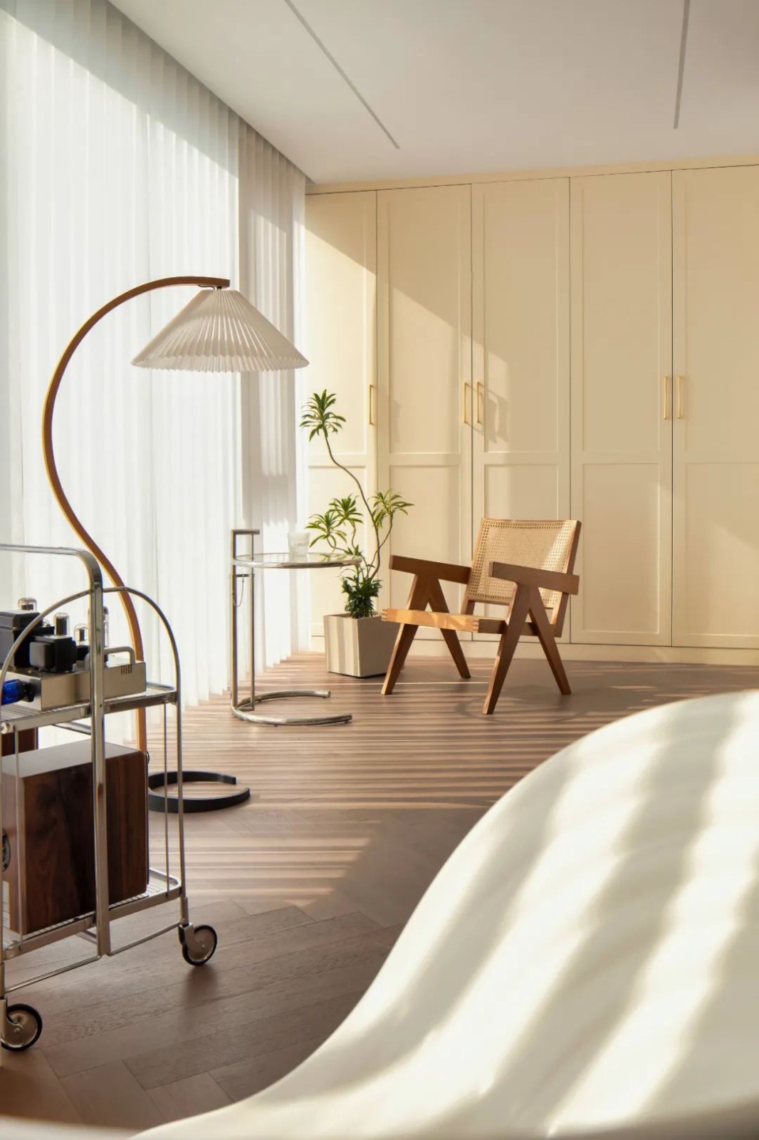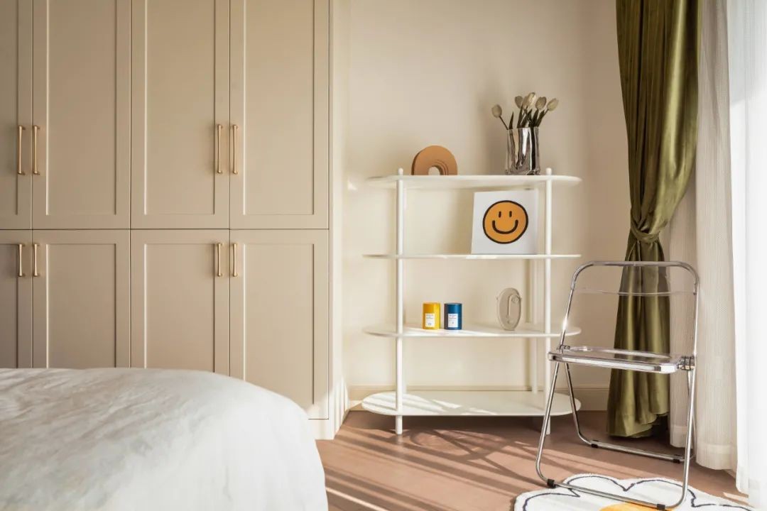 床尾安装衣柜,并在靠窗位置摆一个便携式的展示架与休闲椅,摆上简洁优雅的装饰品,也增添了卧室空间的休闲与惬意感。