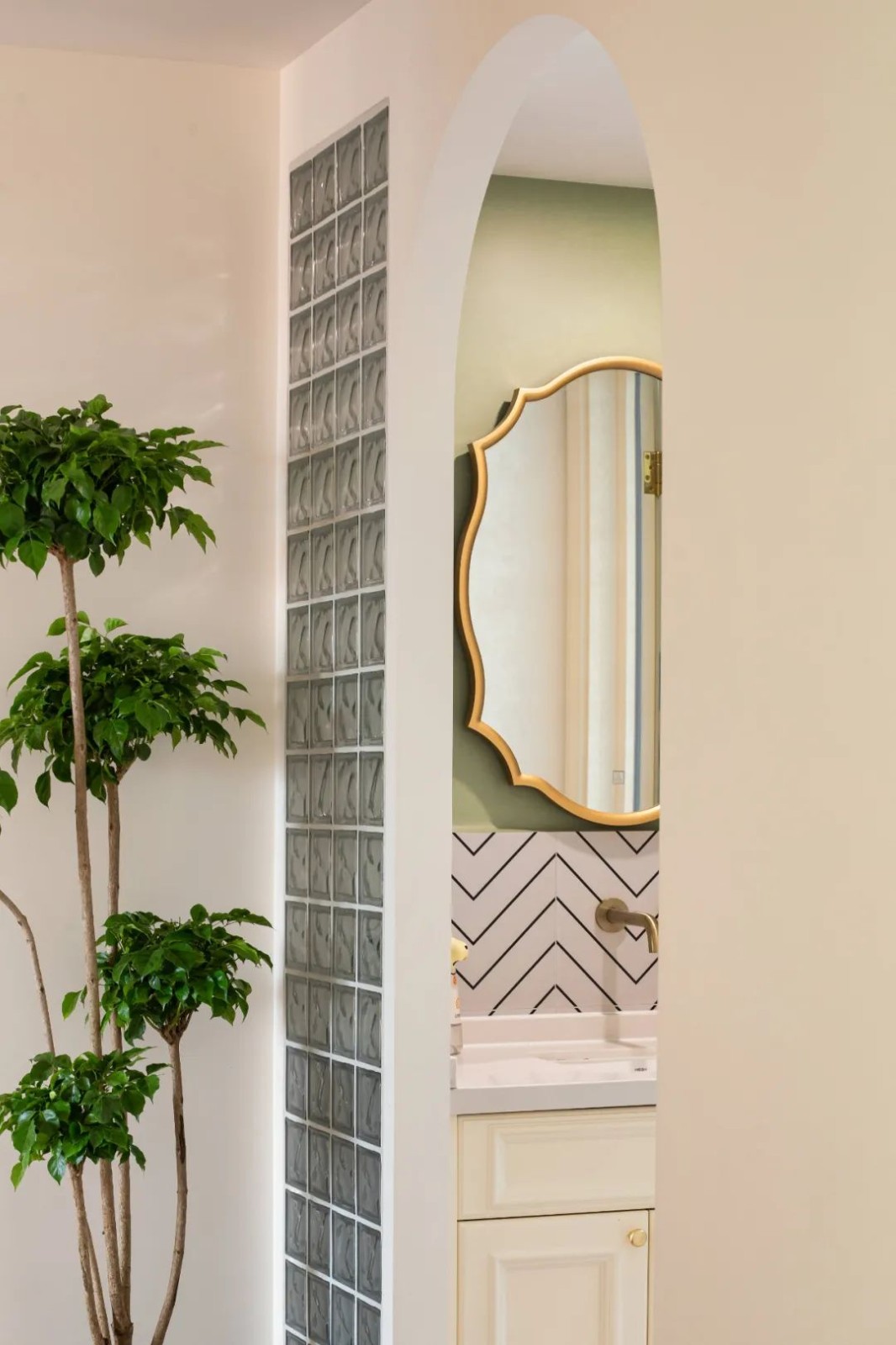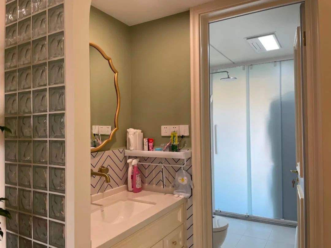 卫生间的洗手盆外置过道区域,以玻璃隔断设计,洗手盆区域以波浪纹墙砖+茶绿色的乳胶漆墙面,挂一面复古范的镜子,使得卫浴空间充满清新精致的气息。