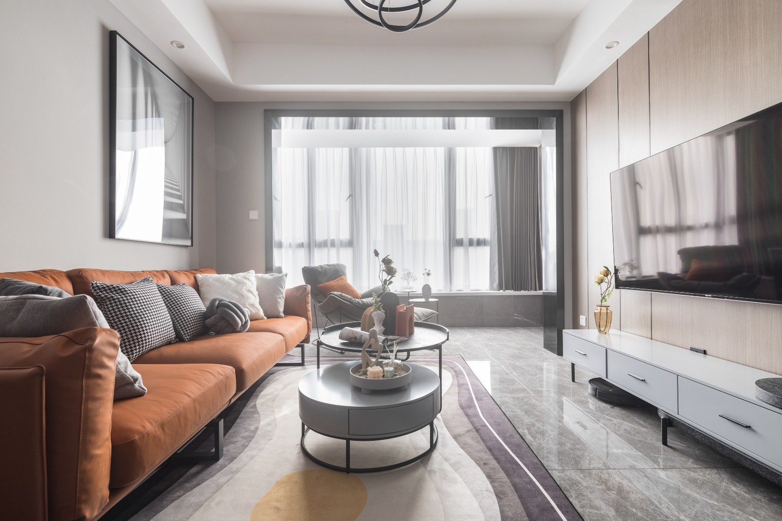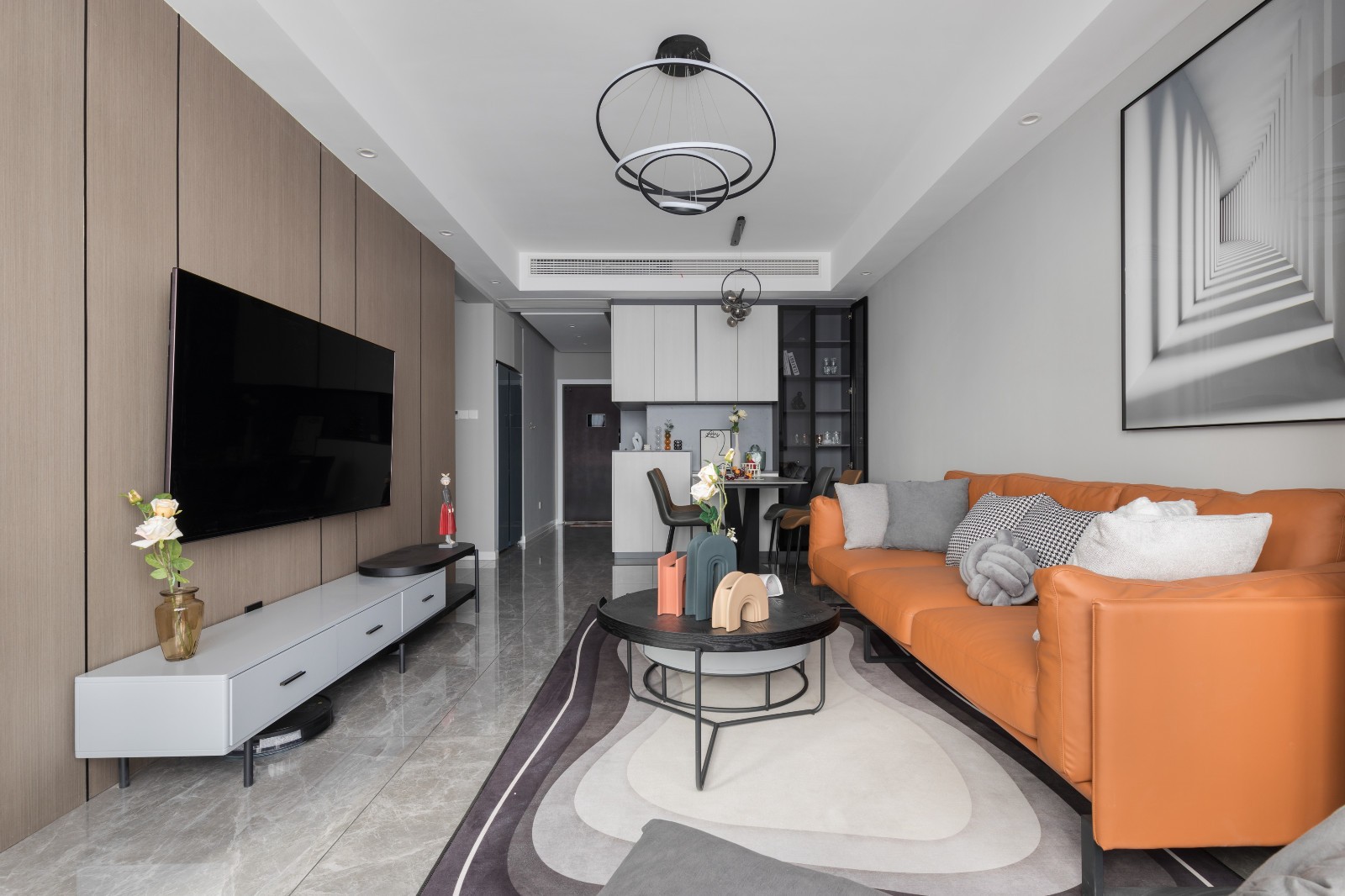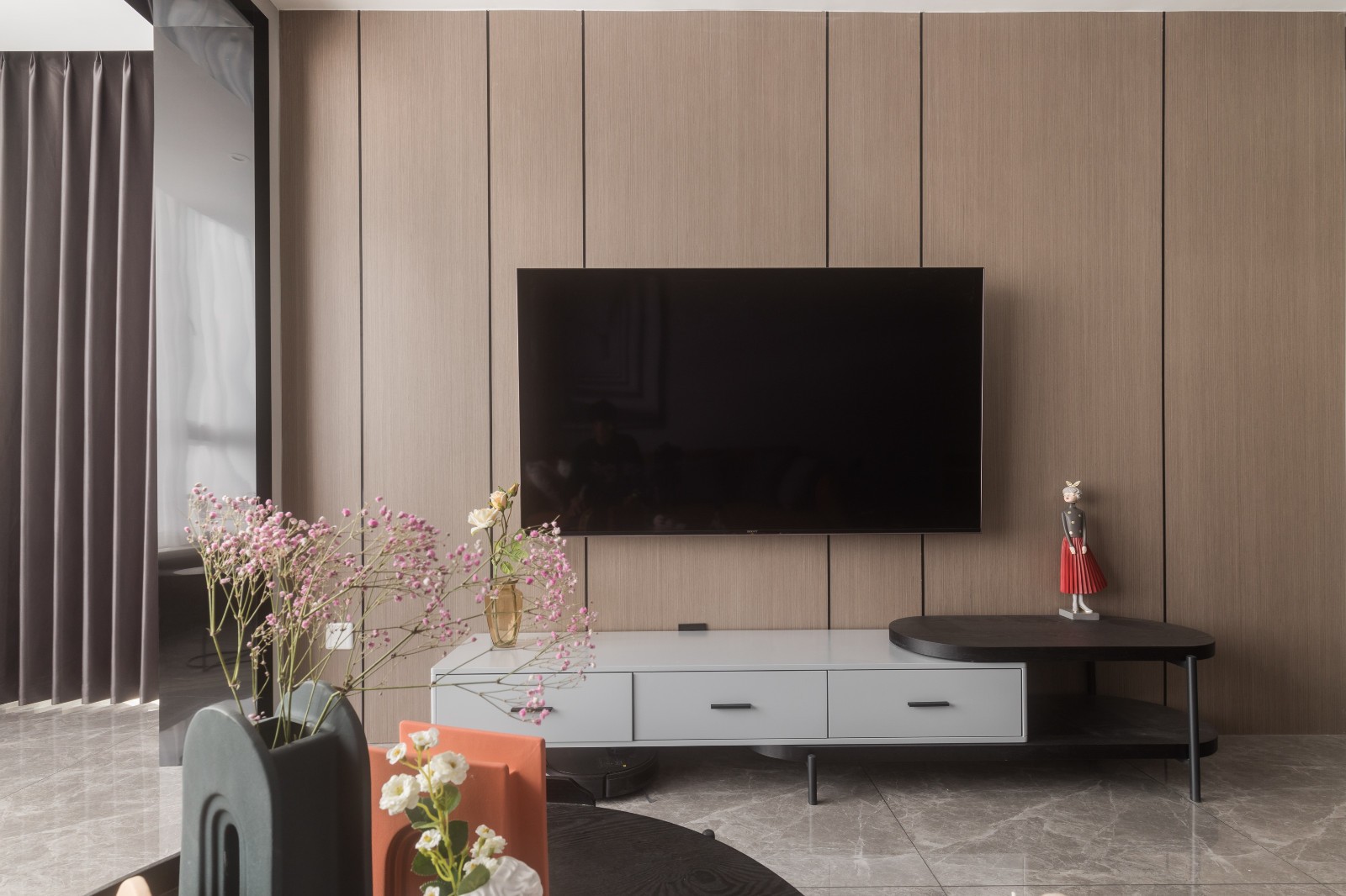 客厅一面是木饰面护墙板,作电视背景墙,搭配同样直线条的电视柜,现代感十足。