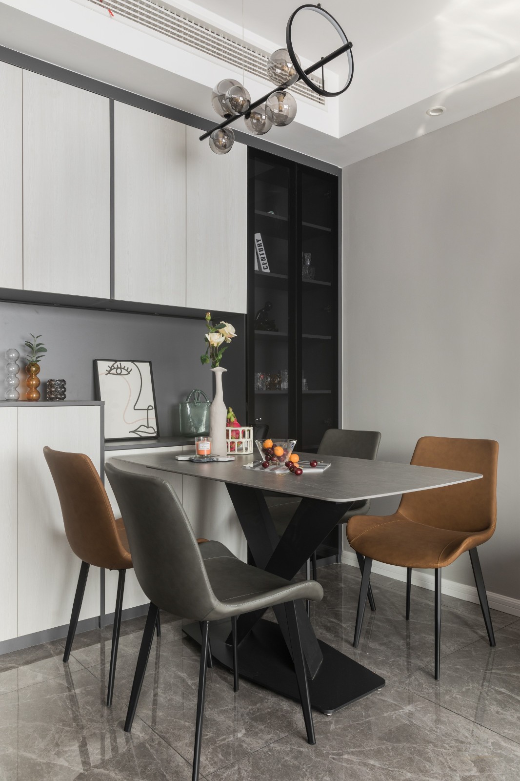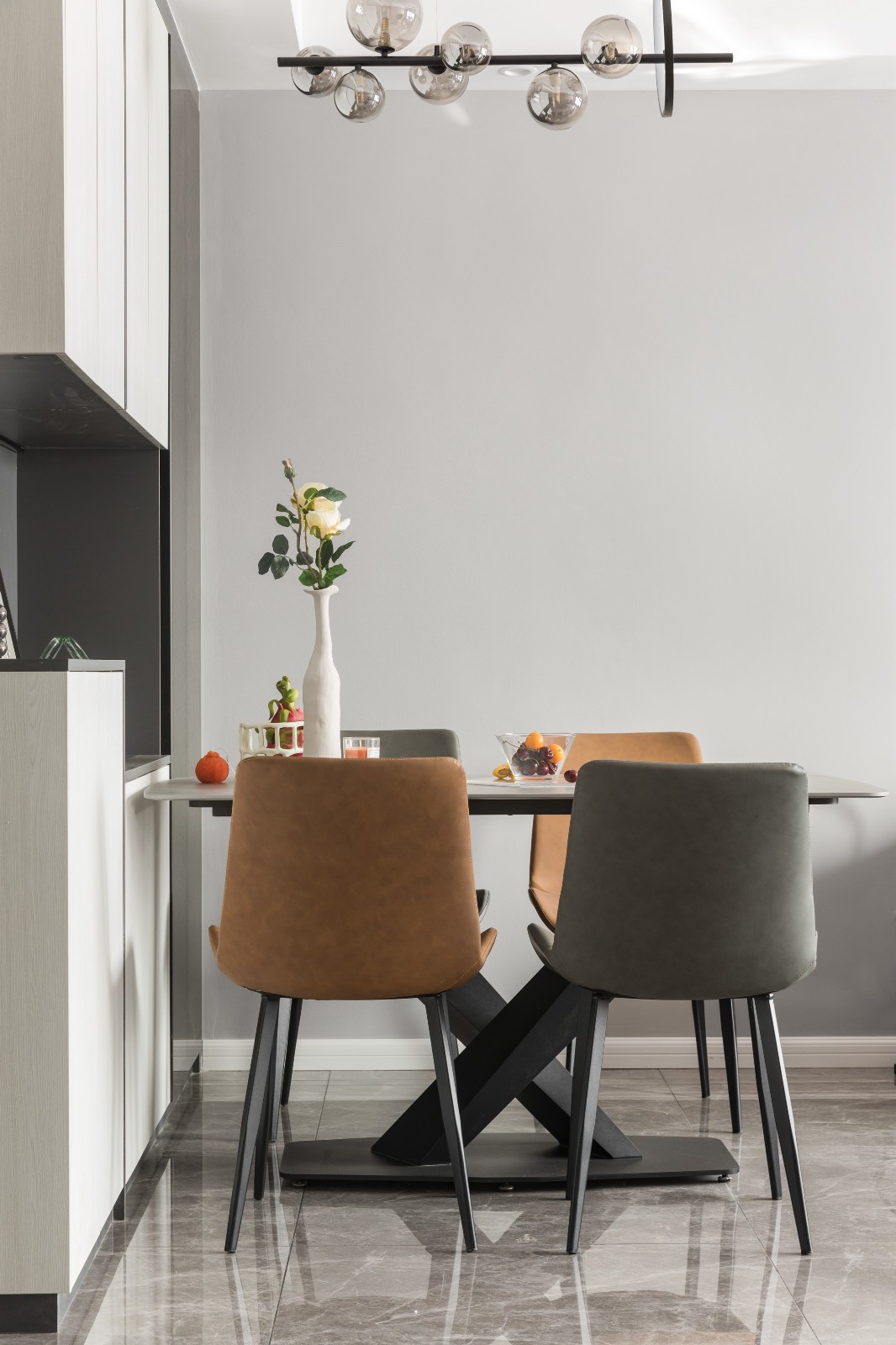 质感细腻的岩板餐桌,与低饱和度的橙***红椅混色灰***红椅,形成一个完美组合。魔豆泡泡吊灯衬托了现代时尚的整体家居风格。