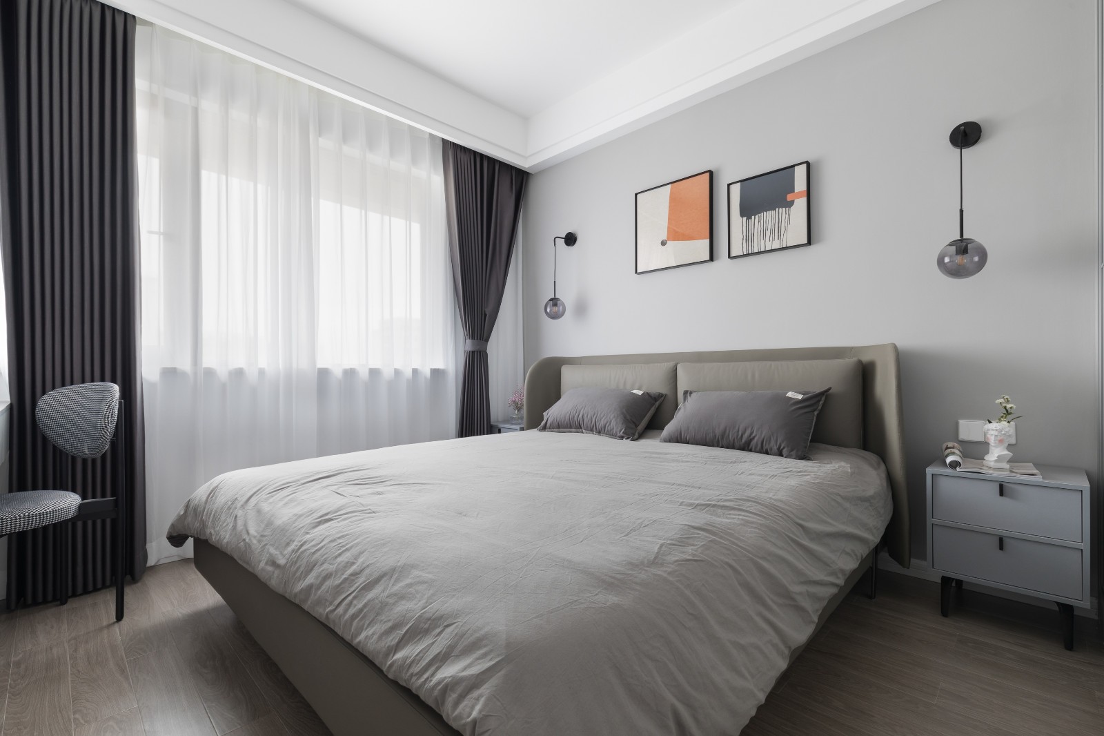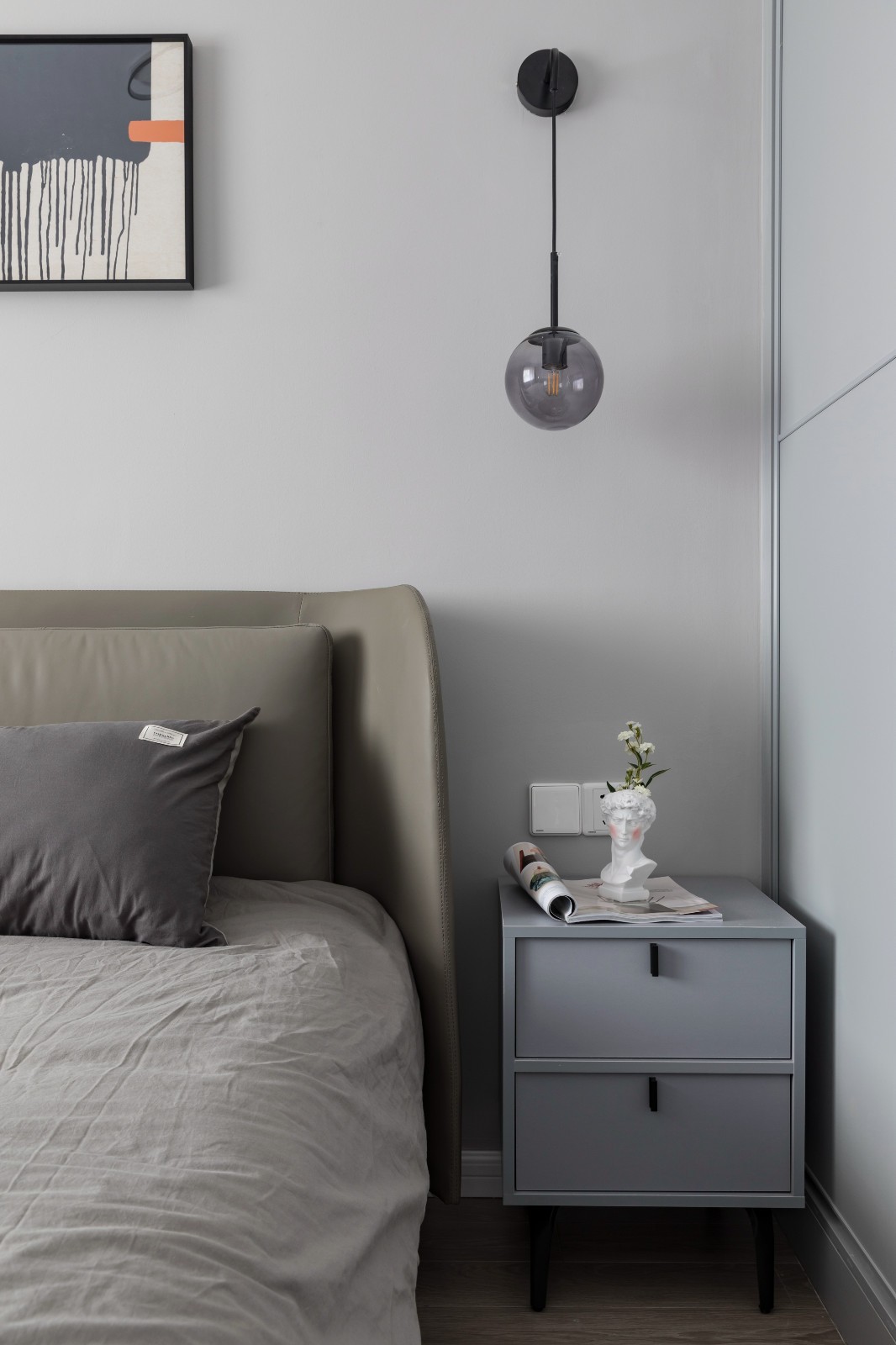 主卧整屋配色简约柔和,能让人很快放松下来。主卧同样填满了屋主喜爱的现代灰色调和抽象艺术画。