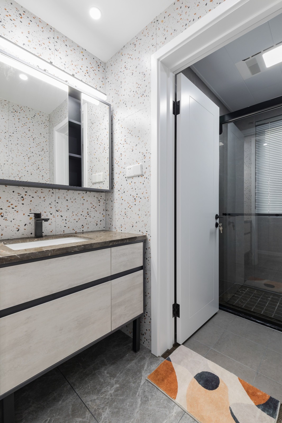 干区墙壁铺水磨石墙砖,吸水率低,碎花造型温柔中透着灵动,为平淡的洗漱空间增添跳跃感。