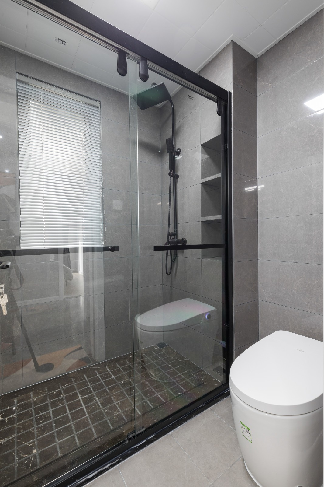 淋浴房的大理石拉槽有助于排水,光脚淋浴也不会泡在水里,简直大大提升了幸福感。花洒旁开辟分层壁龛,放置洗浴用品,狭小空间得到了合理利用。