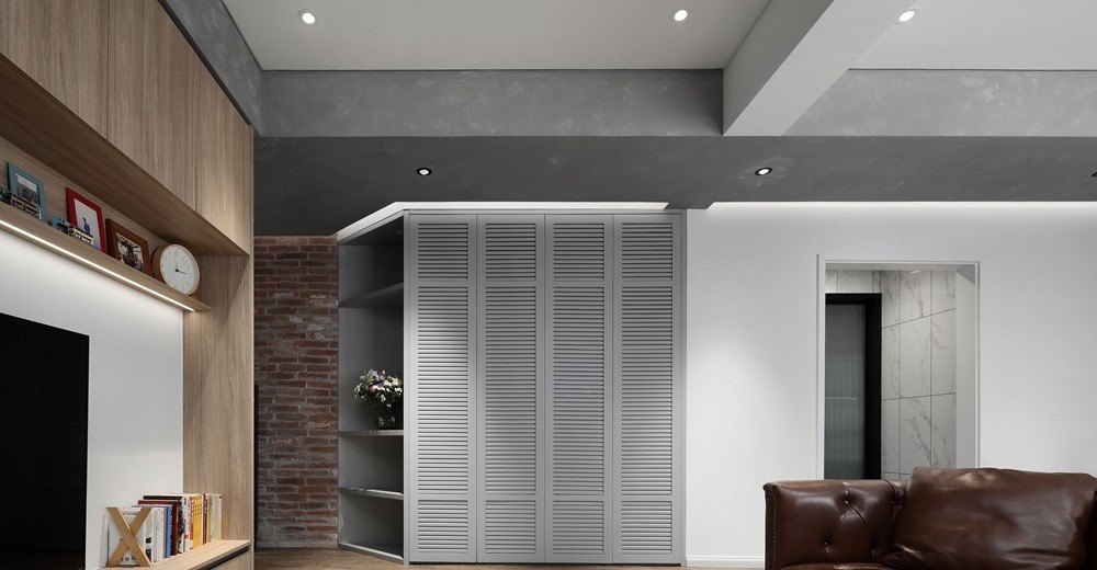 男主人喜欢这个玄关走廊,特别定制的玄关柜呼应着特别定制的红砖墙。水泥质感的天花、不加修饰的红砖墙在光的效果下,完美地展现了一片他喜欢的文艺工业风。