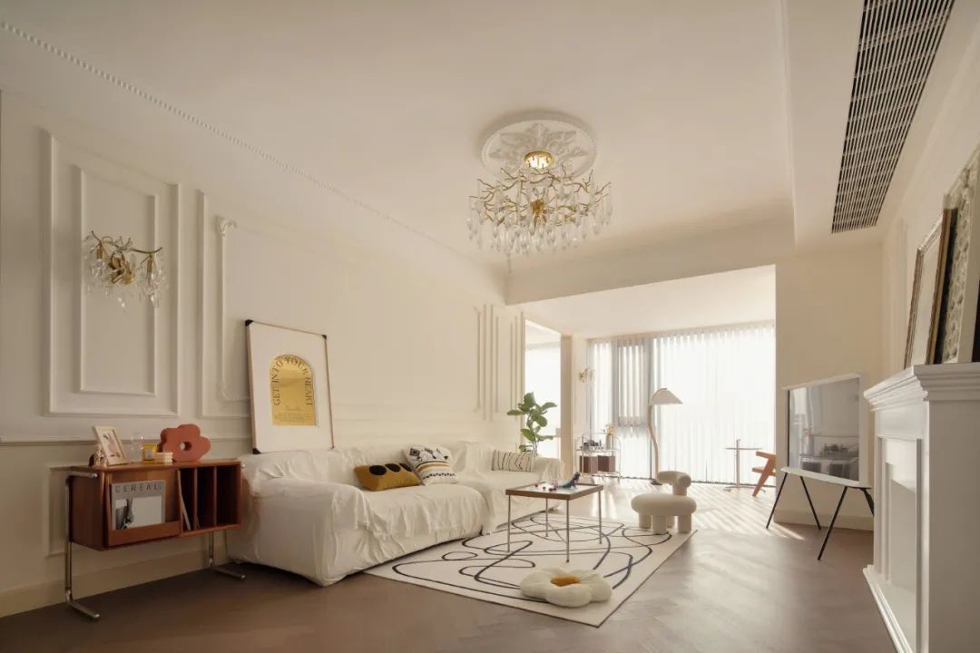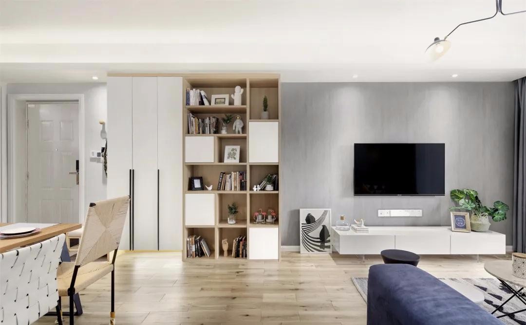 客厅是原木色与白色搭配的简约风,木地板让空间自带温润气质。取消主灯设计,用点光源呈现出更为简洁开阔的空间。