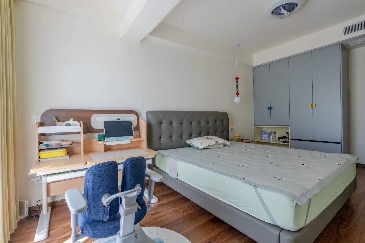 这是一间满是男孩元气感的卧室,雾霾蓝定制衣柜自带时尚腔调,造型独特的边几与趣味床头吊灯一搭,瞬间让空间活力拉满。开阔的布局尽显通透感,一侧的成品书桌 + 护脊椅组合,妥妥承包了阅读学习的小天地,让整个房间既个性又温馨。