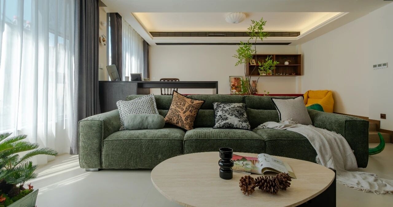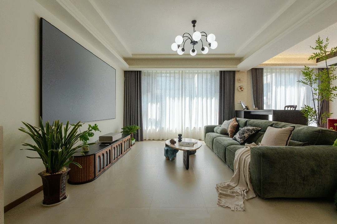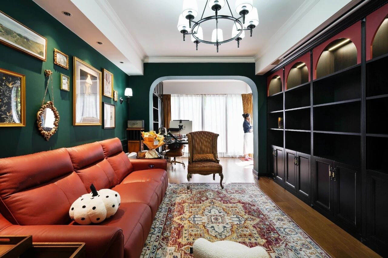 客厅与开放式休闲区的一体设计,堪称 “情绪价值拉满” 的生活美学范本。墨绿色灯芯绒沙发以软糯质感锚定空间重心,搭配复古多头玻璃球吊灯,暖光晕染下,