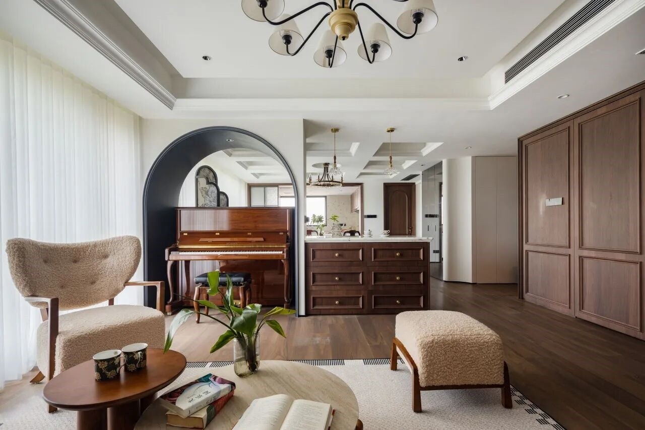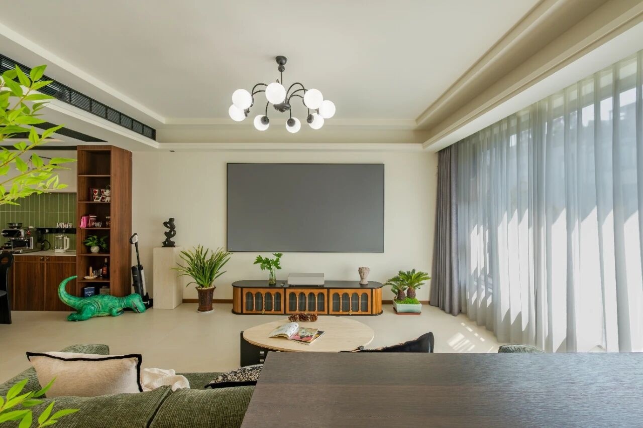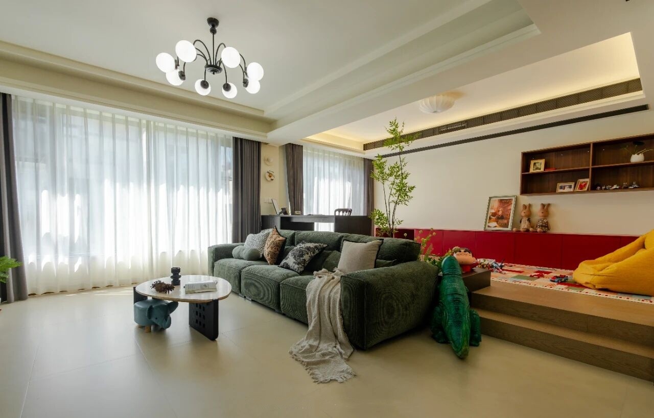 通透的采光透过纱帘洒入,软装的层次、色彩的碰撞,让整个空间既是能容纳全家欢笑的生活场,也是藏着复古与童趣设计巧思的美学容器。
