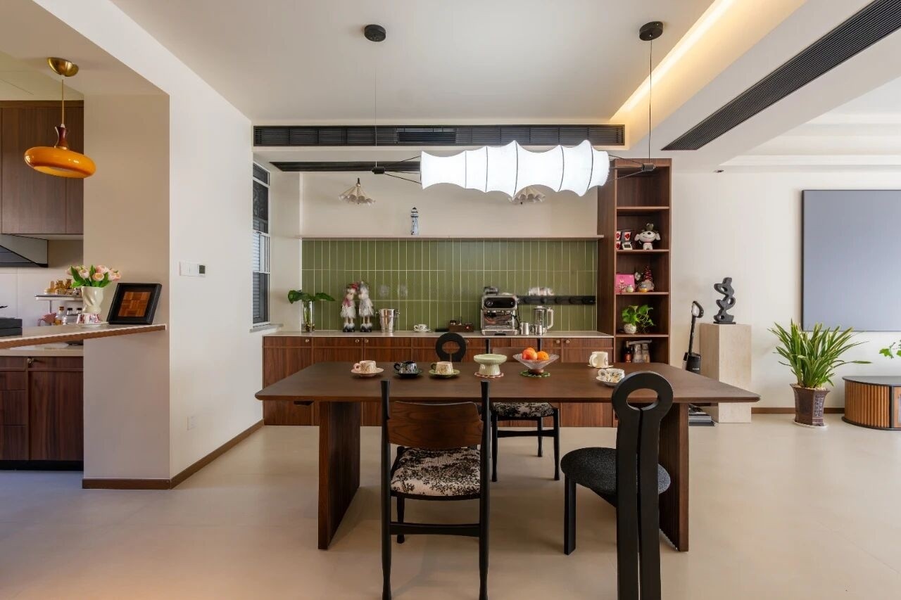 实木大长桌承载三餐四季的烟火,配两款风格迥异却相融的餐椅:***木质靠背搭复古花纹布艺坐垫,***以黑色框架 + 环形艺术靠背显复古艺术的现代张力。各式花纹杯具、餐盘点缀,既添空间层次趣味,又将中古风灵魂融入日常烟火,更显业主一家对生活的热忱,满溢的情绪价值让空间处处萦绕治愈人心的生活诗意。