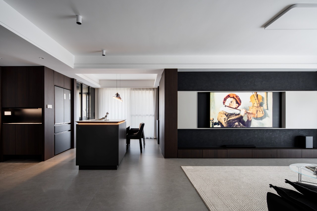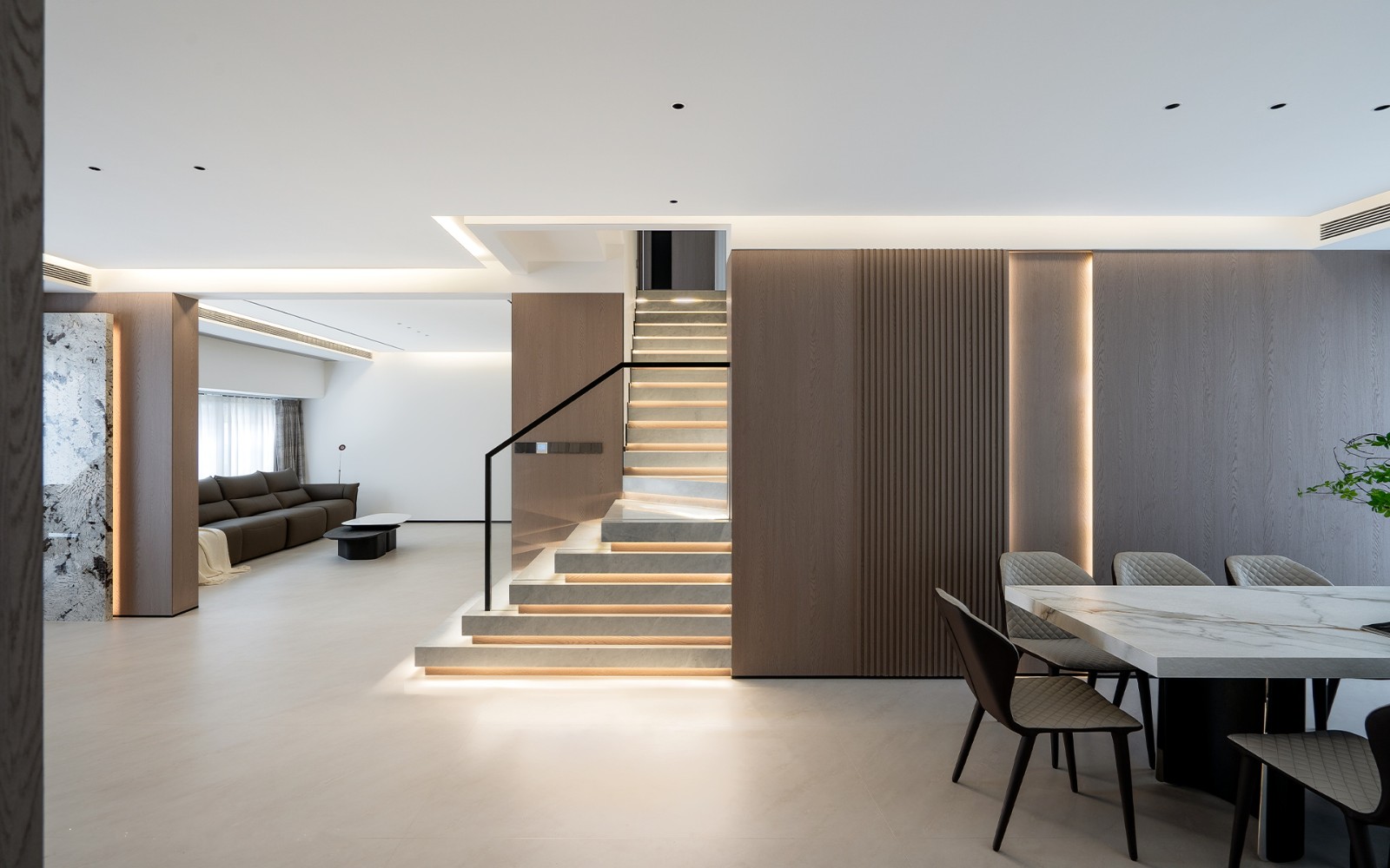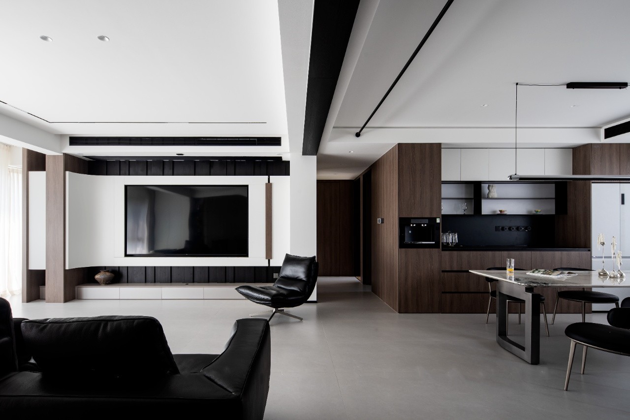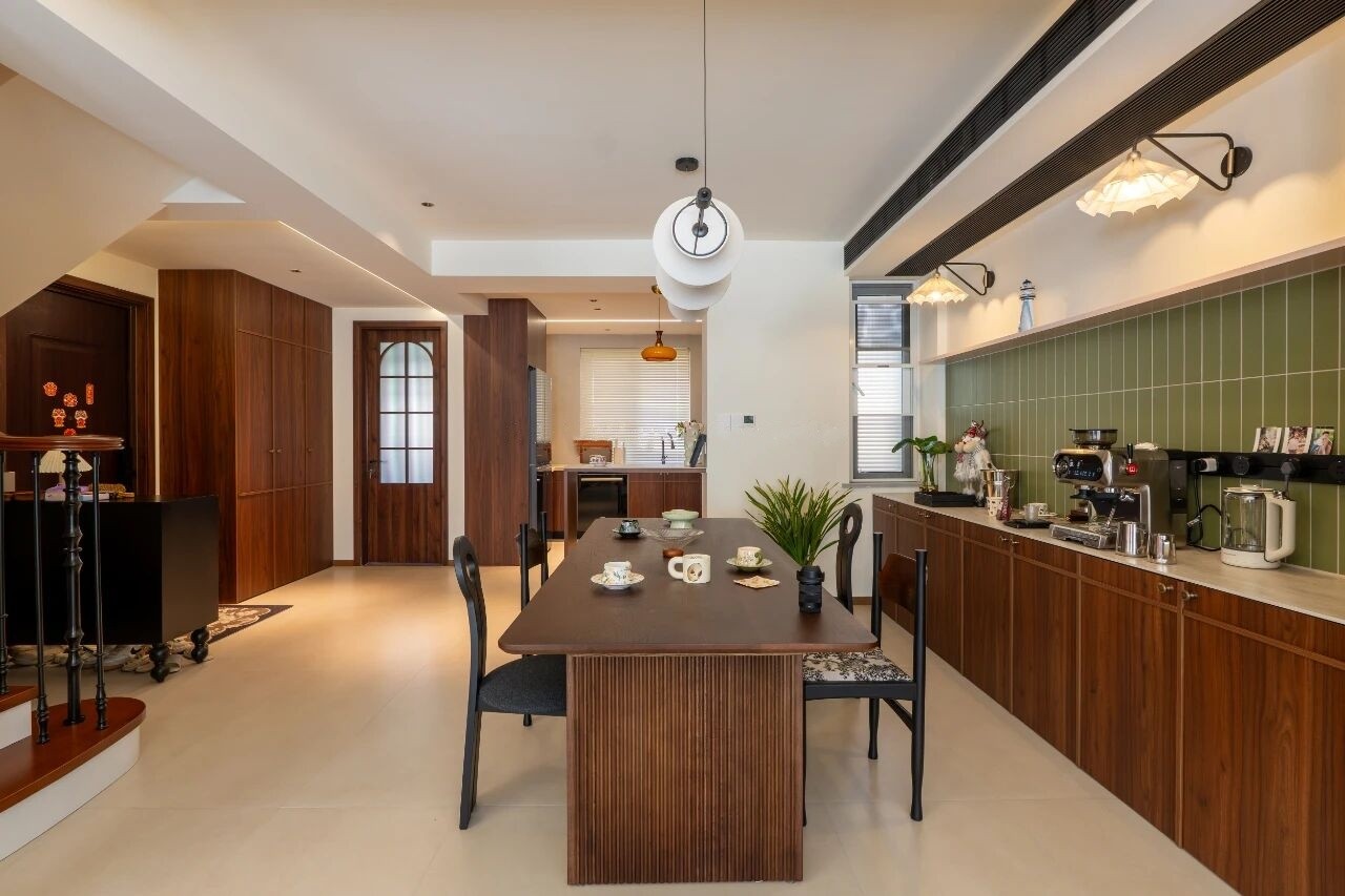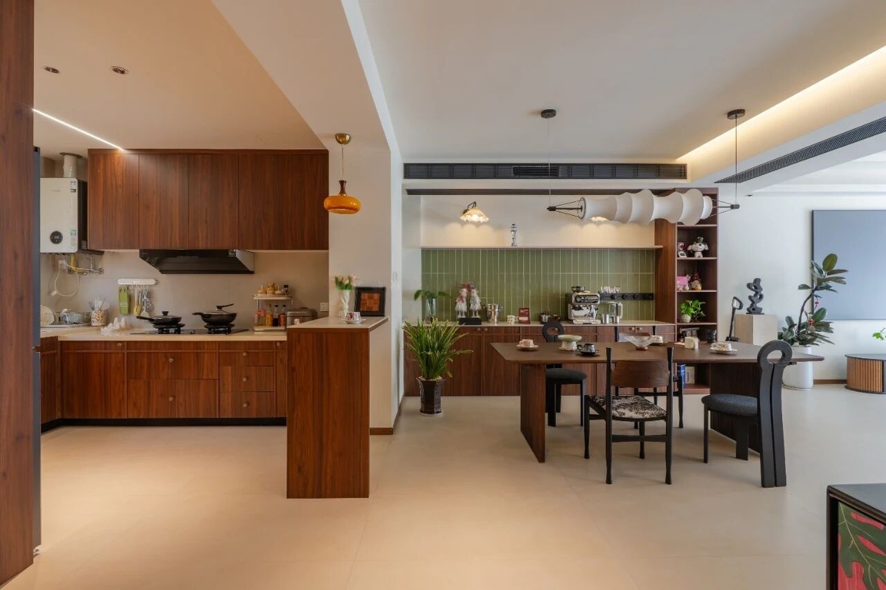 胡桃木家具的沉稳质感与奶油白空间的柔和调性温情邂逅,开放式餐厨相连的设计又让烹饪与用餐的互动自然流转,二者碰撞让复古不再沉闷。