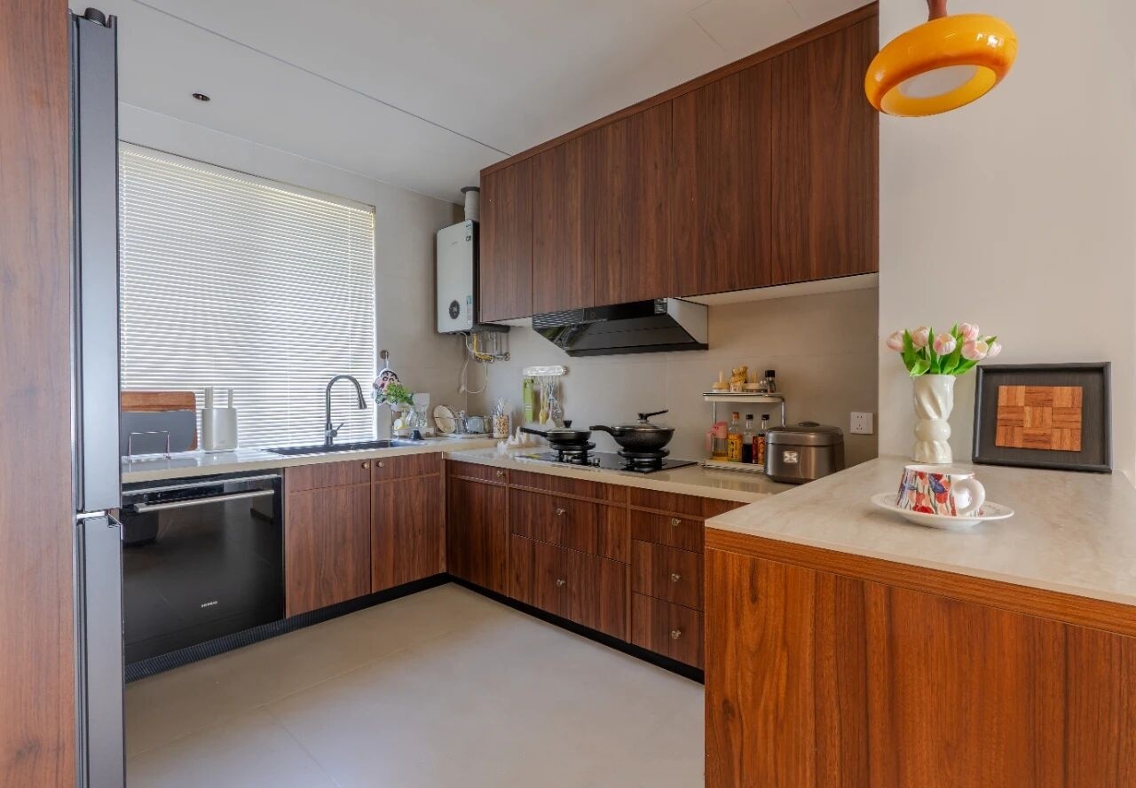 开放式厨房的设计处处透着家的温暖质感,胡桃木色整体橱柜自带温润气息,蜂窝大板吊顶利落又显***,地砖与客餐厅通铺让空间更显开阔。