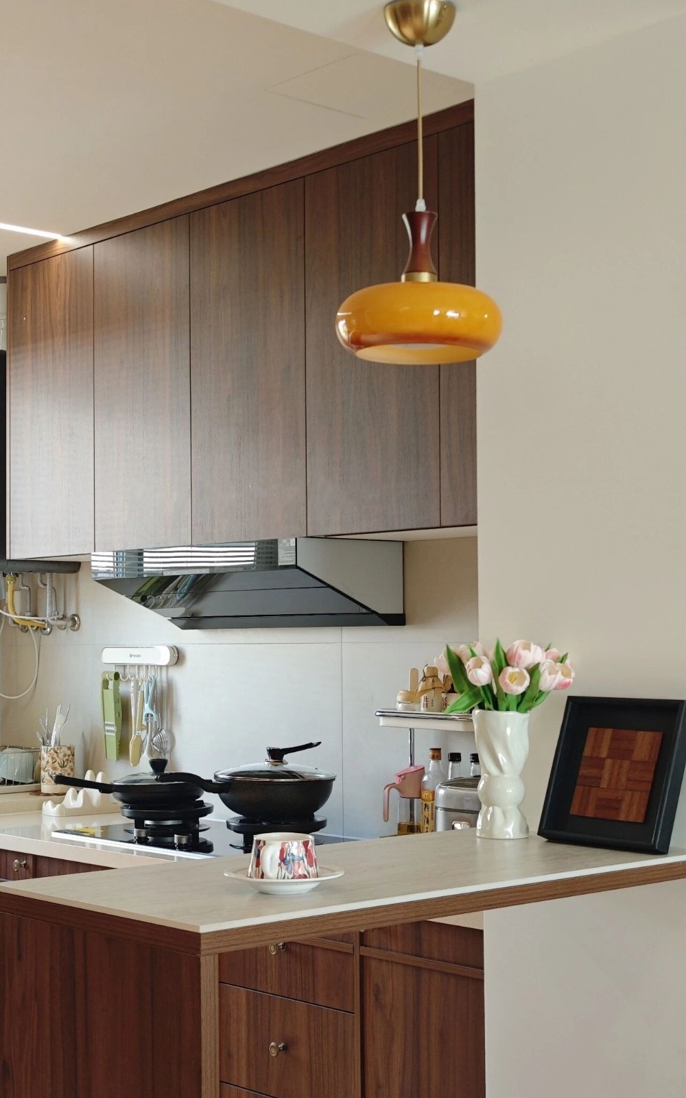 巧妙利用与餐厅相邻的承重柱区域打造吧台,搭配一盏爱马橙装饰吊灯,瞬间让餐厨区的氛围感拉满,每一处规划都藏着对生活的热爱。