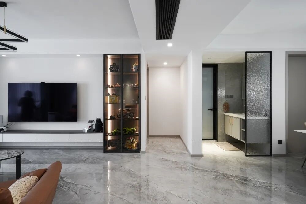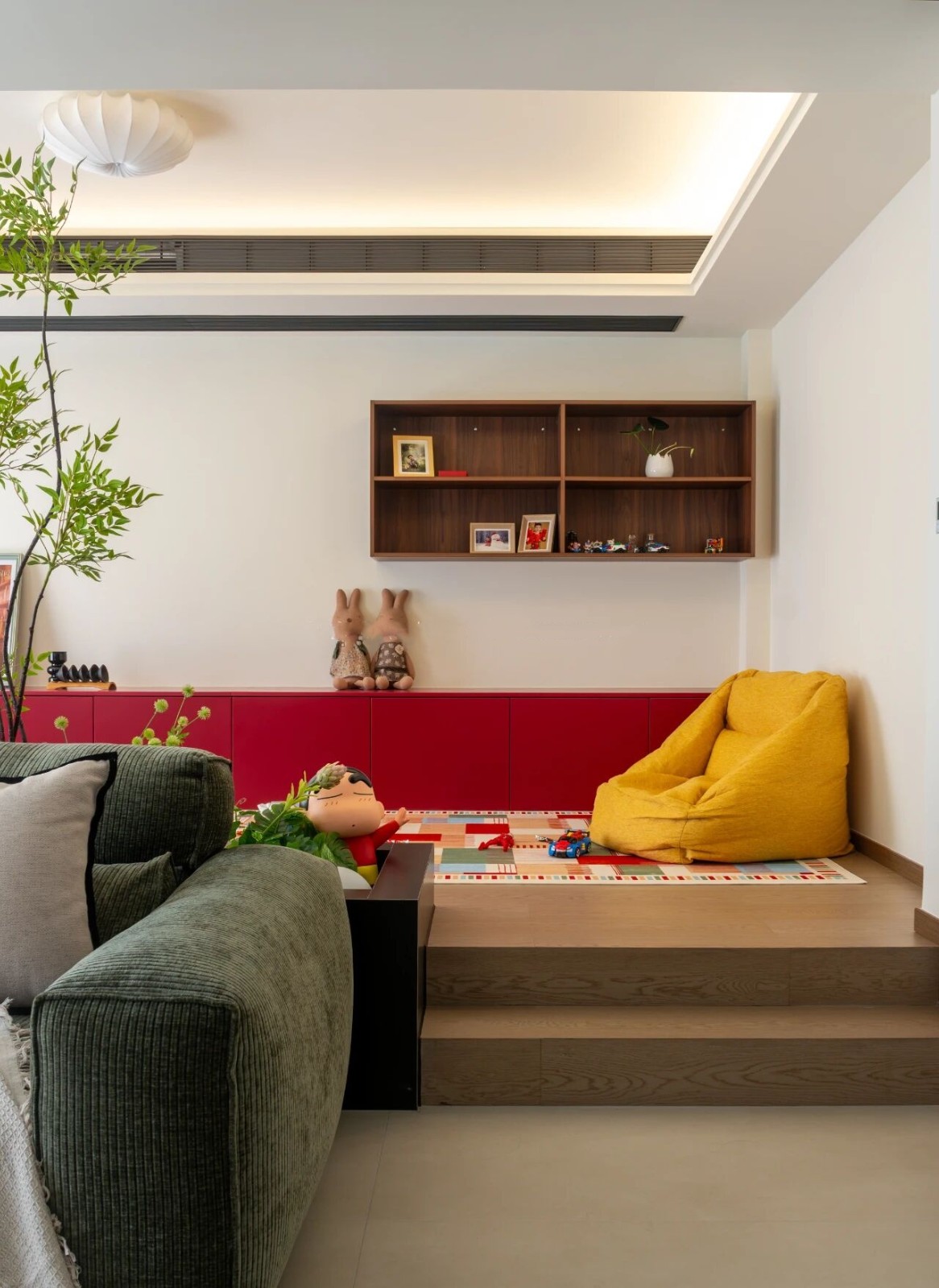 更妙的是与休闲区的一体衔接 —— 红色柜体迸发活力感,台阶式设计划分出亲子互动的专属天地,玩具与萌趣摆件点缀其间,将 “家的烟火气” 与 “设计的巧思感” 糅合得恰到好处。