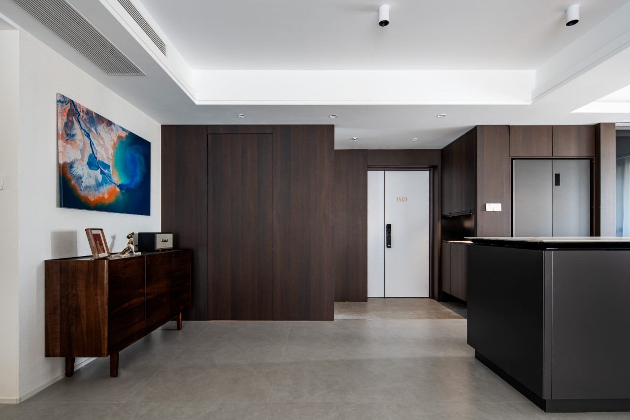 空间整体以黑白棕色系为主色调,大面积的留白带来安静舒缓的空间气质,强烈的色差对比,也为家带来更为丰富的视觉,质感也因考究的用材而略显上乘。