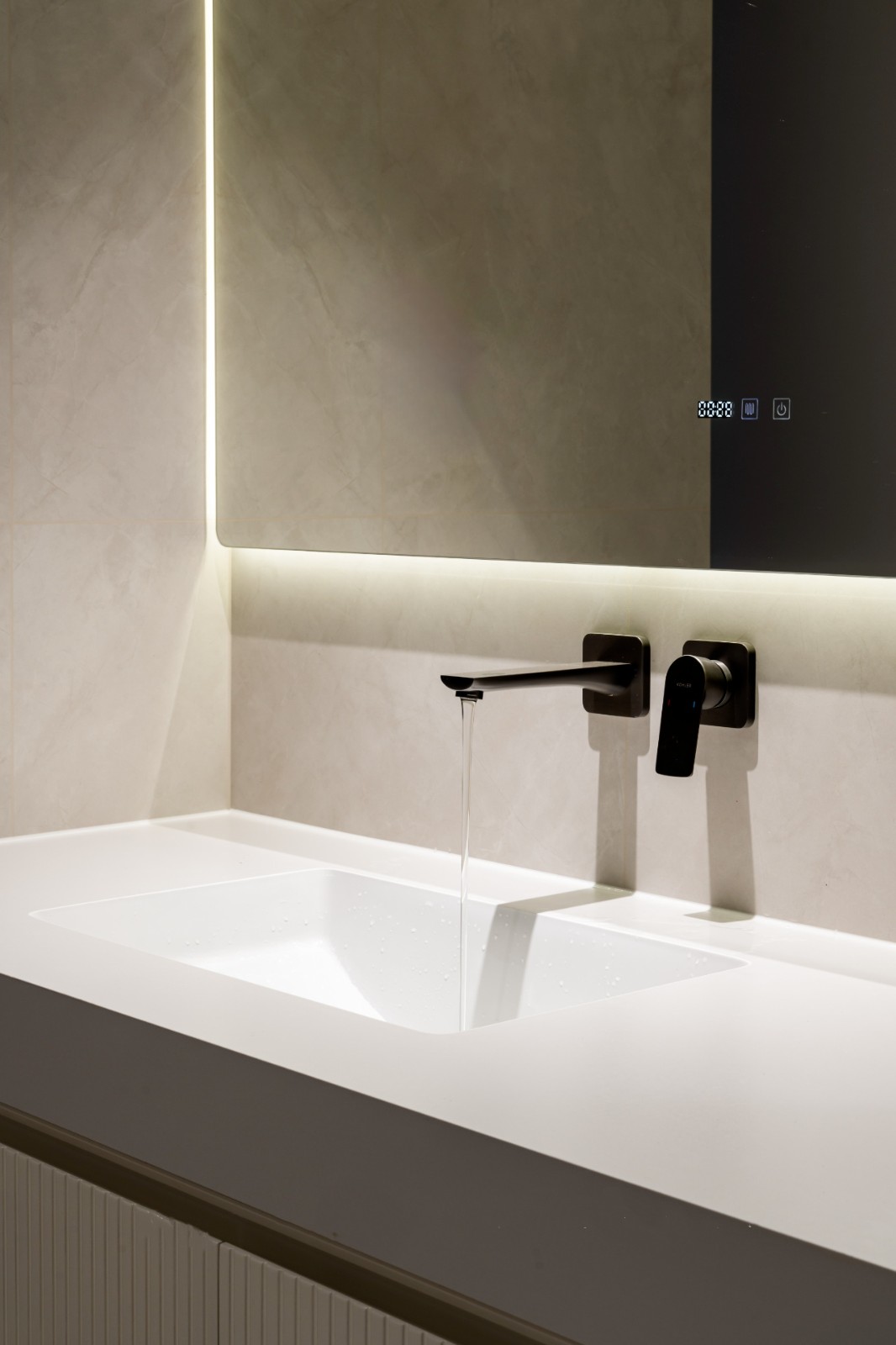 卫生间采用干湿分离的布局设计,纯黑色白纹墙地砖搭配木色纹理台盆柜,时尚自然,再加上智能马桶及LED镜柜,让业主及家人的生活品质得到进一步的提升!