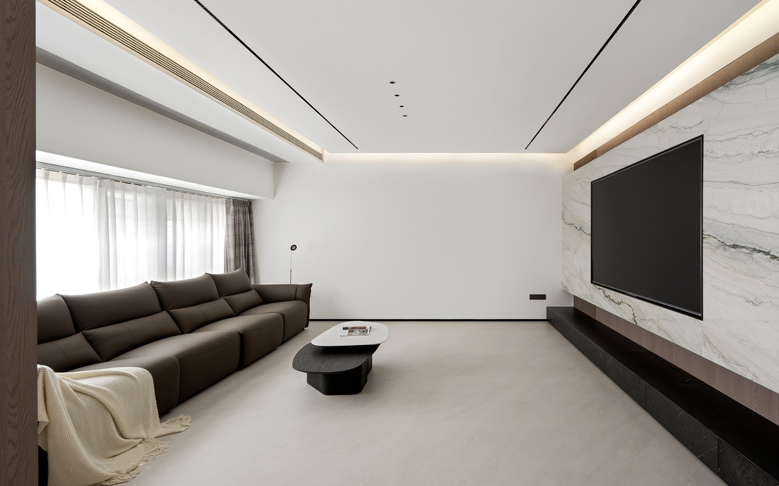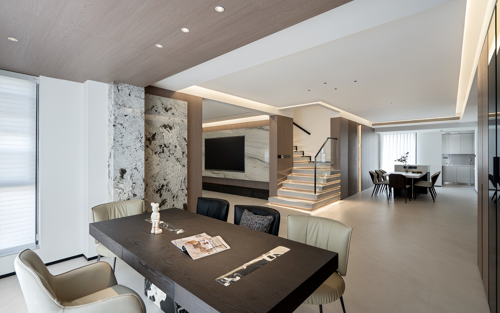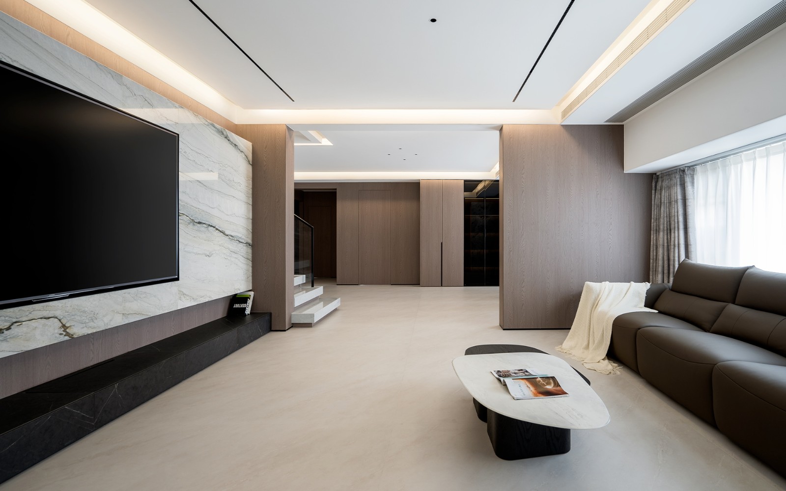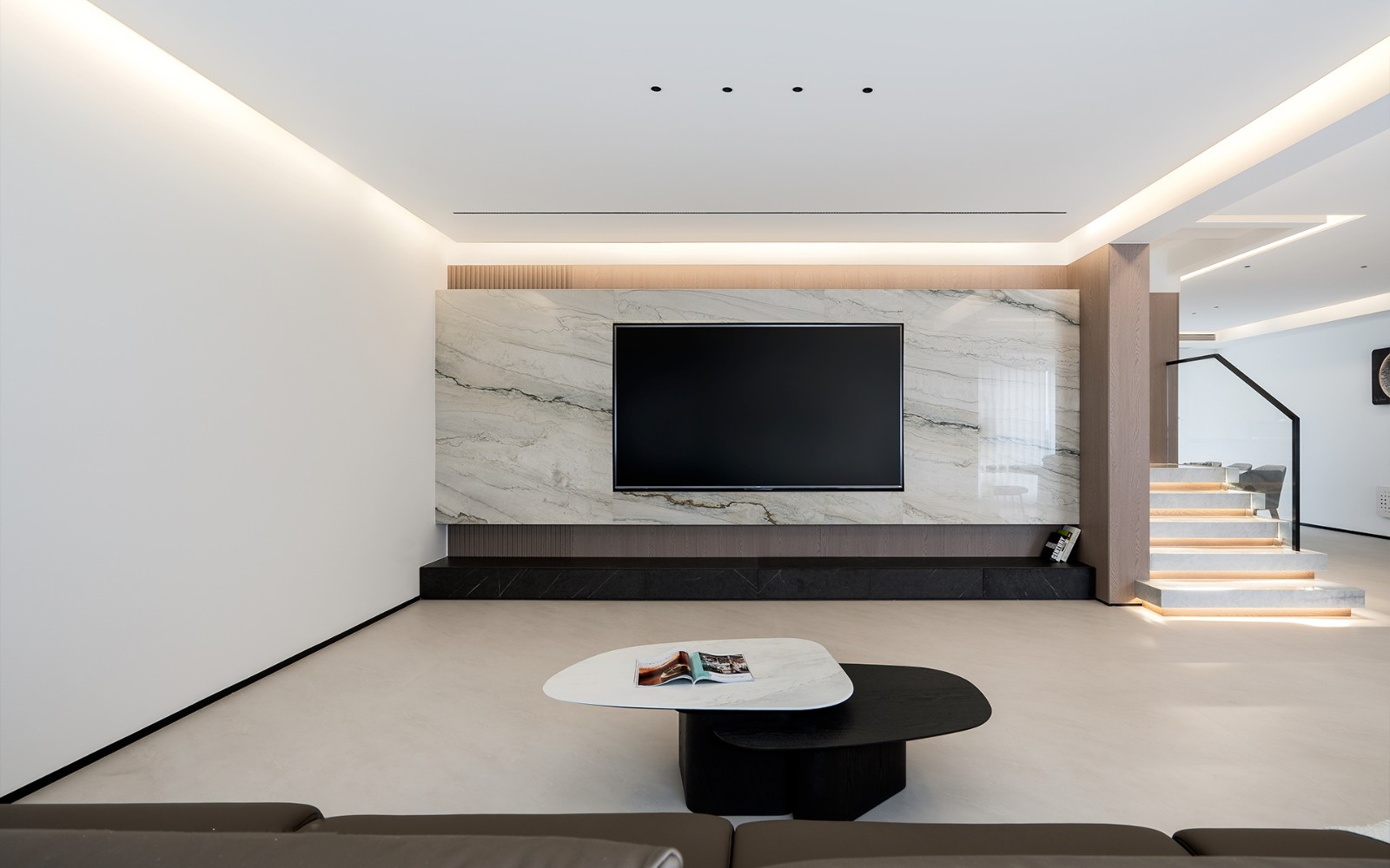 客厅以白色、木色等浅色调为主,搭配大理石的纹理和深色的家具部分