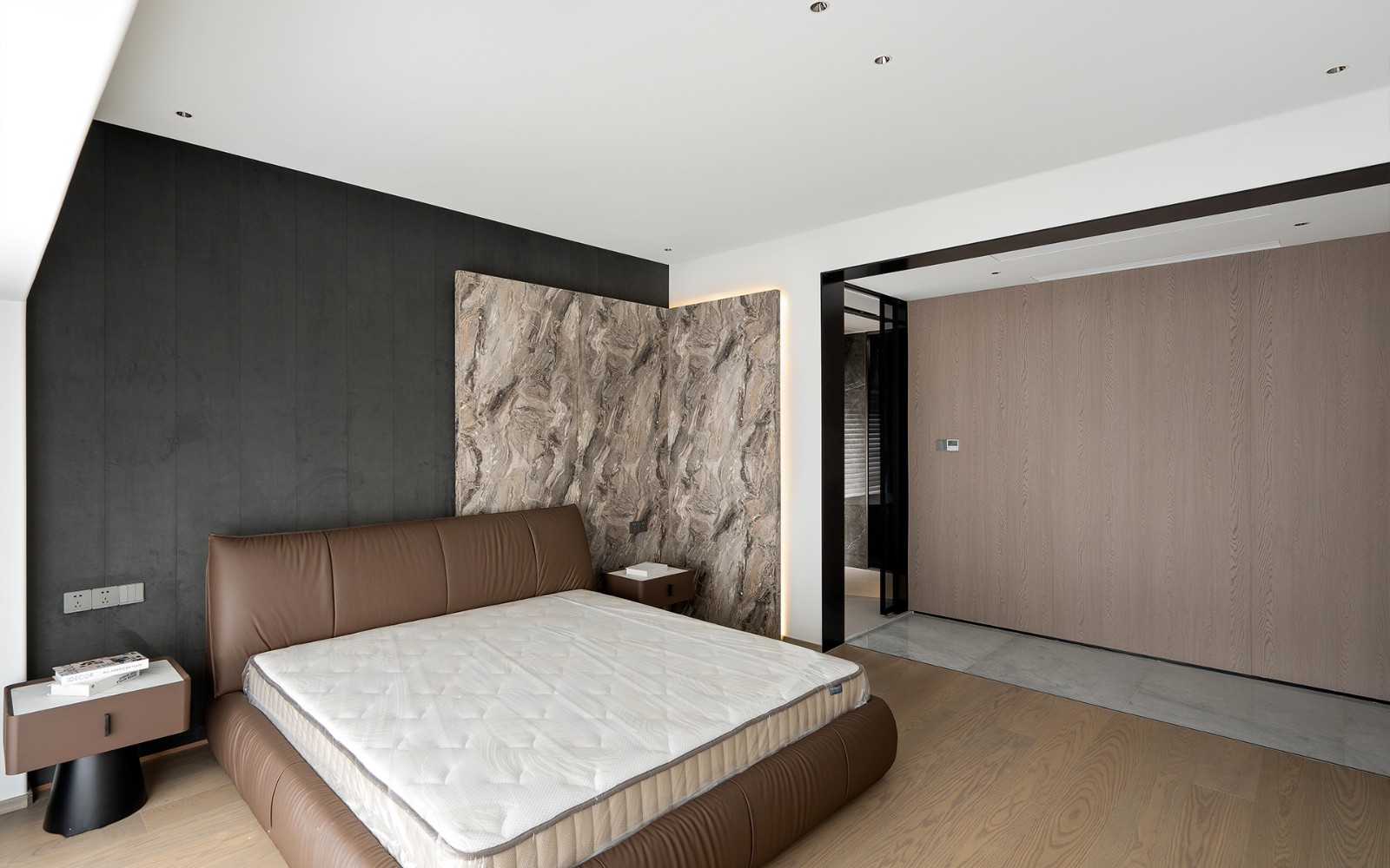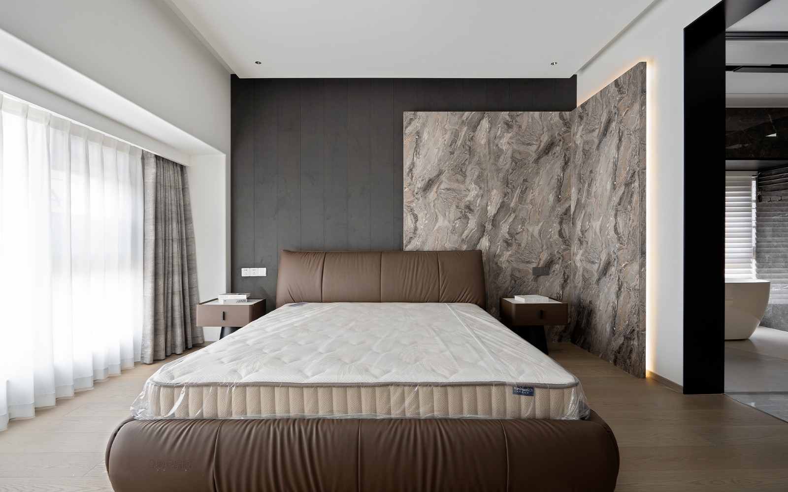 大理石纹理的背景墙极具视觉冲击力,自然的纹理如同艺术画作,成为主卧的视觉焦点。