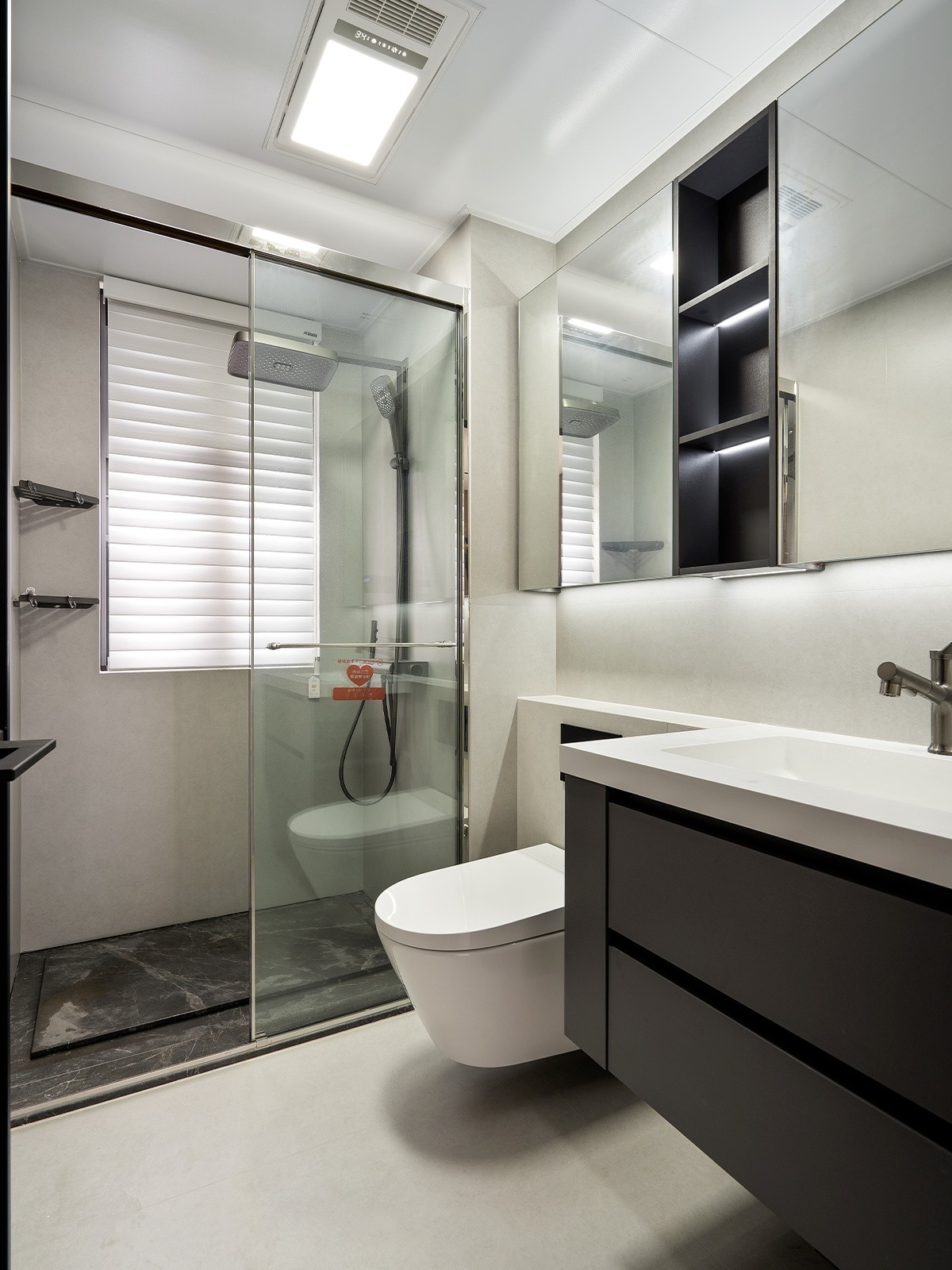 采用玻璃隔断将淋浴区与其他区域隔开,实现了干湿分离,不仅提升了使用的便利性,也有利于保持卫生间的干燥和清洁。