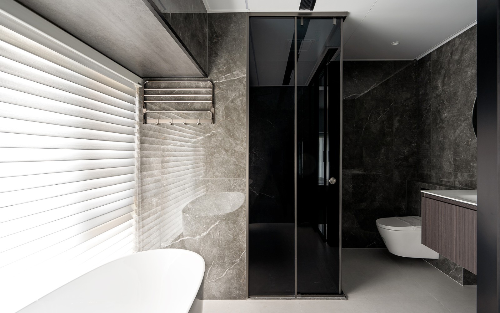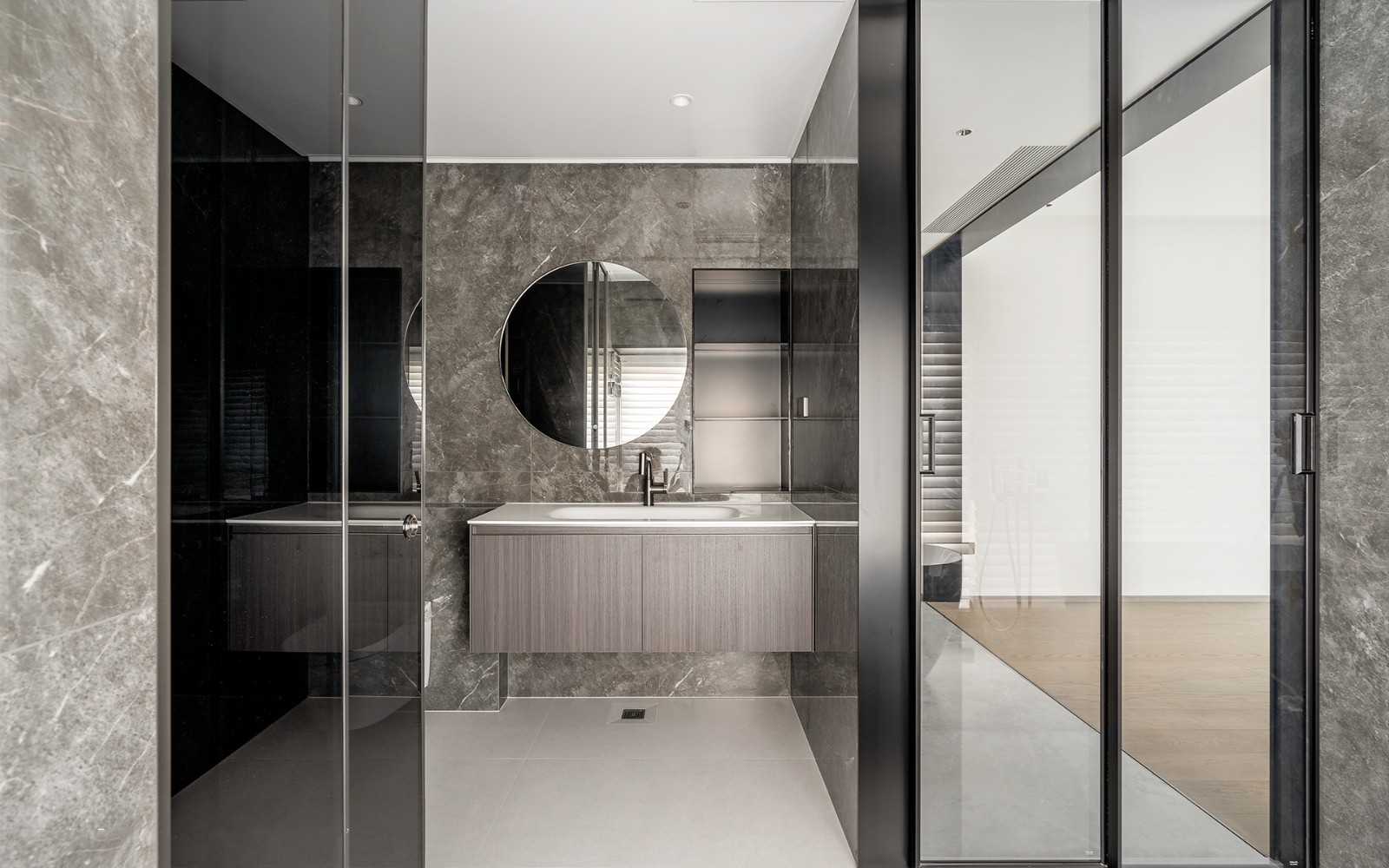 主卫大量使用大理石材质,深浅不同的大理石纹理相互搭配, 营造出***、大气的视觉效果。