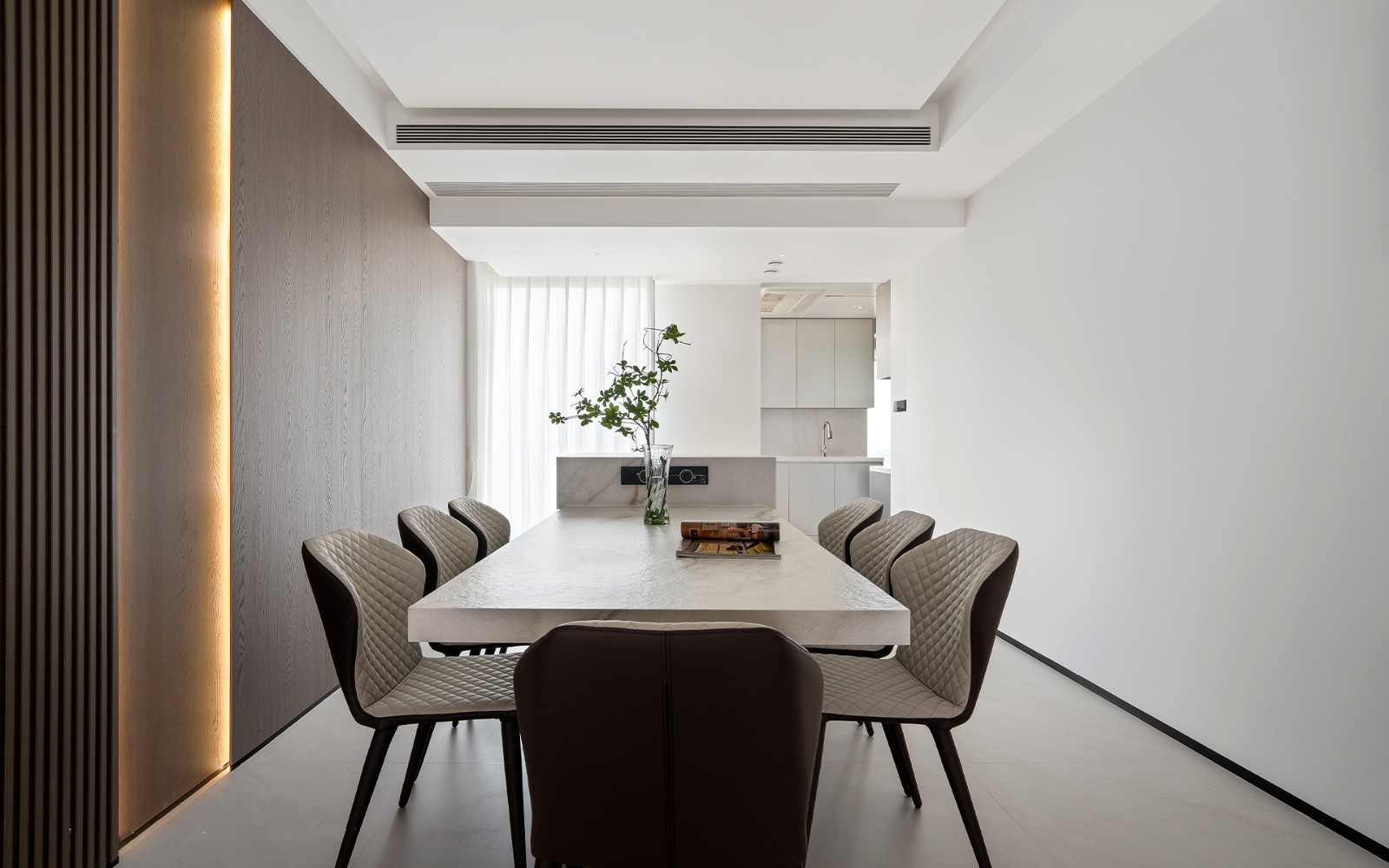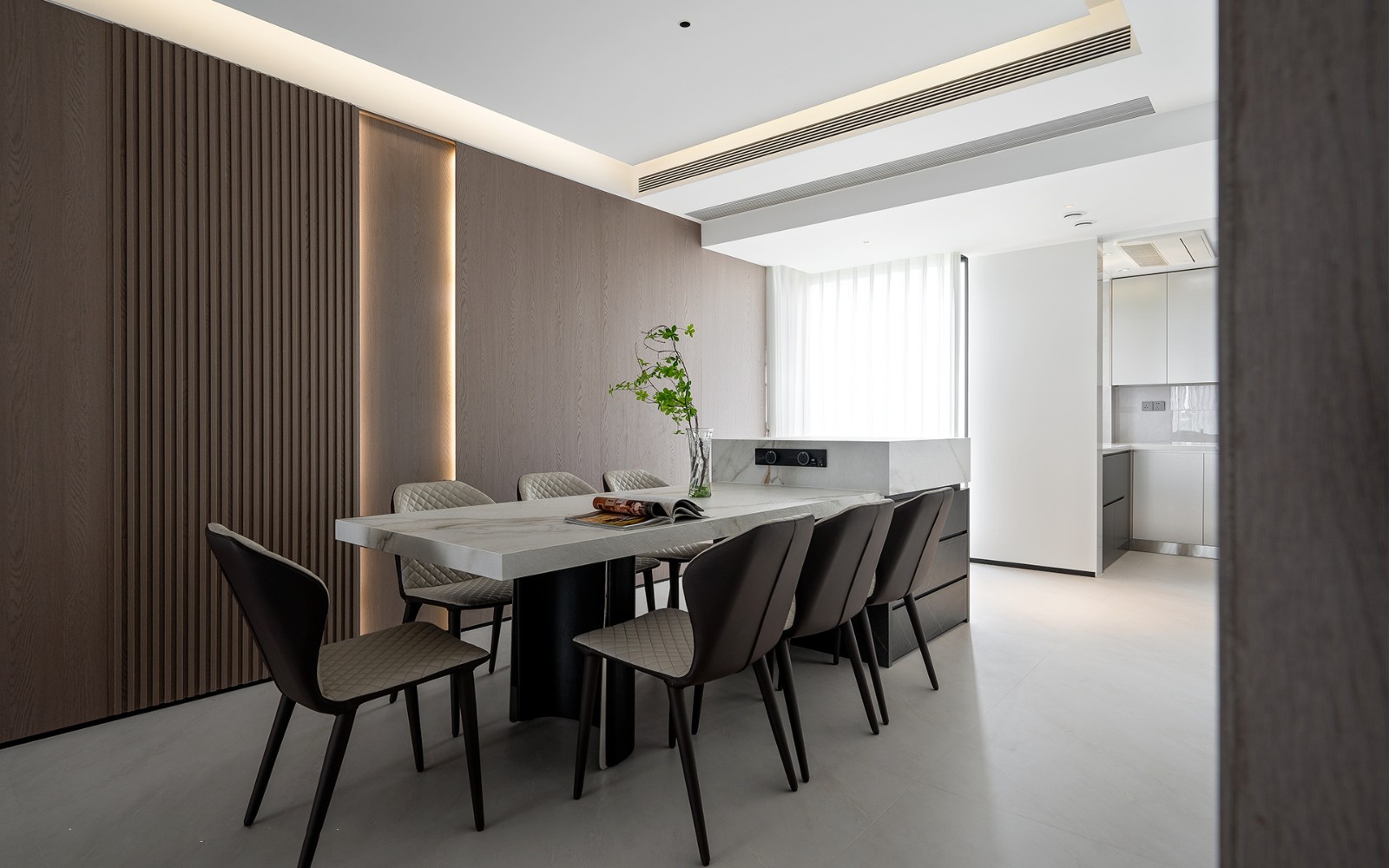 餐桌造型简约大气,搭配的座椅舒适且设计感十足,桌上的小摆件精致小巧,为餐厅增添了细节美感,让整个用餐环境既舒适又充满艺术氛围。