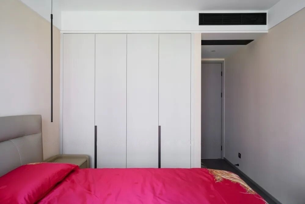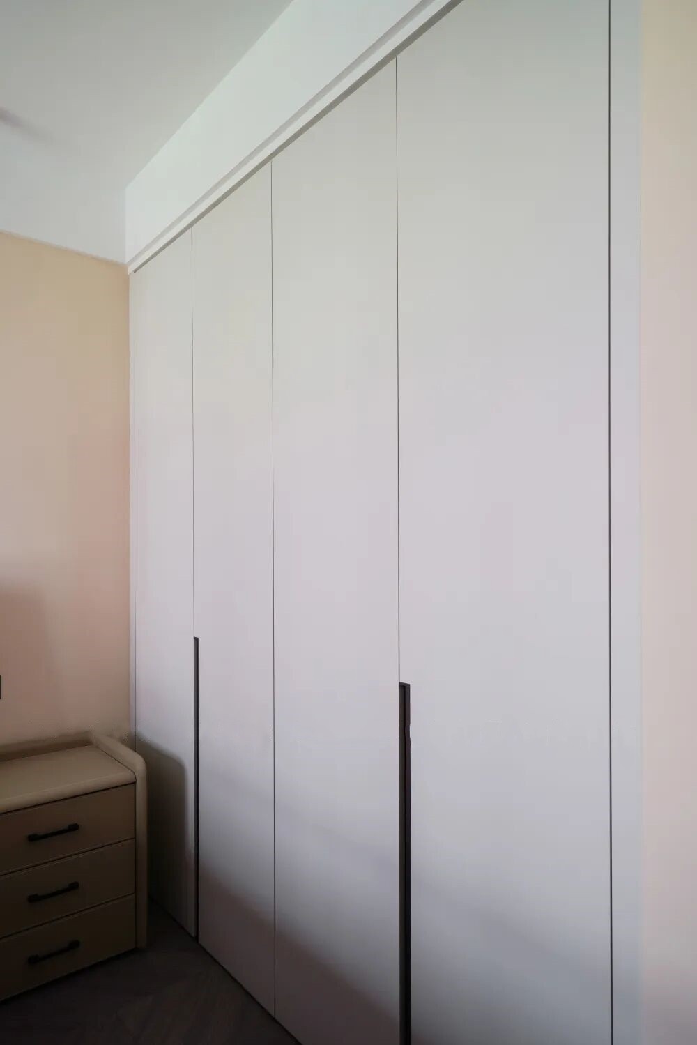 墙面选择米白色的乳胶漆色,整个空间很温馨。选择1.8*2.1m的婚床,同时考虑到未来小朋友放婴儿床的位置。
