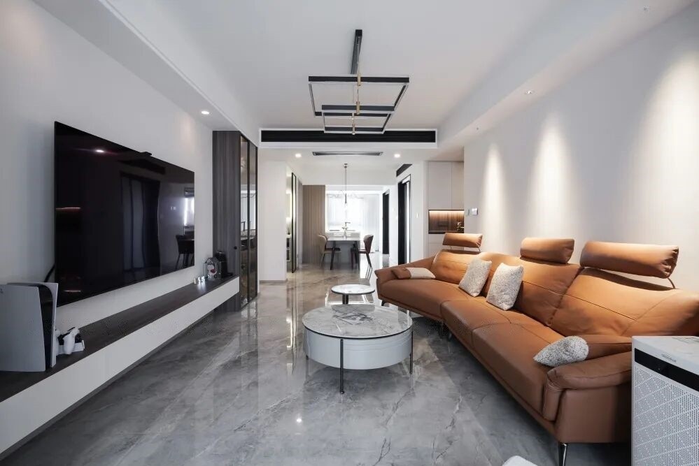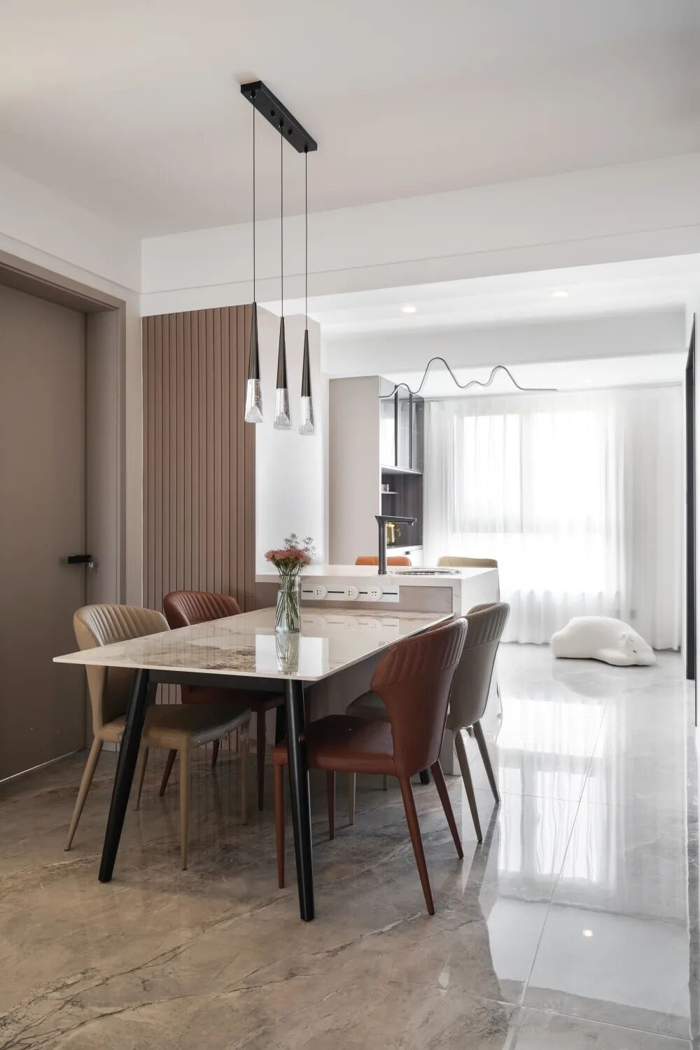 客餐厅一体化设计,750*1500的连纹大理石抛釉砖从客厅通铺到餐厅北阳台,精致大气,舒适整洁。