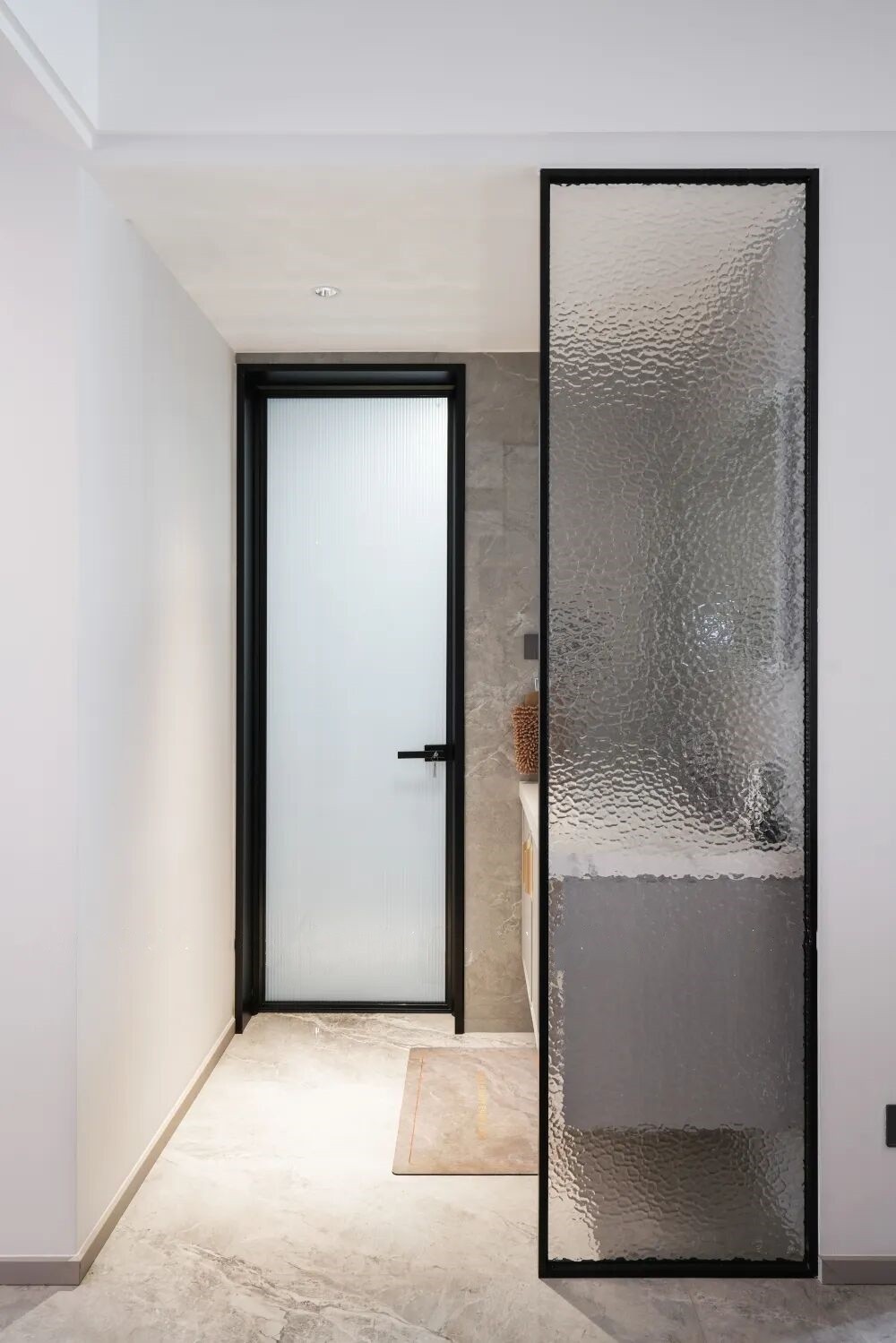 干区的水纹玻璃有种朦胧唯美的艺术效果。干区与湿区用磨砂长虹玻璃做隔断,保护隐私,整体空间采光性也更好。