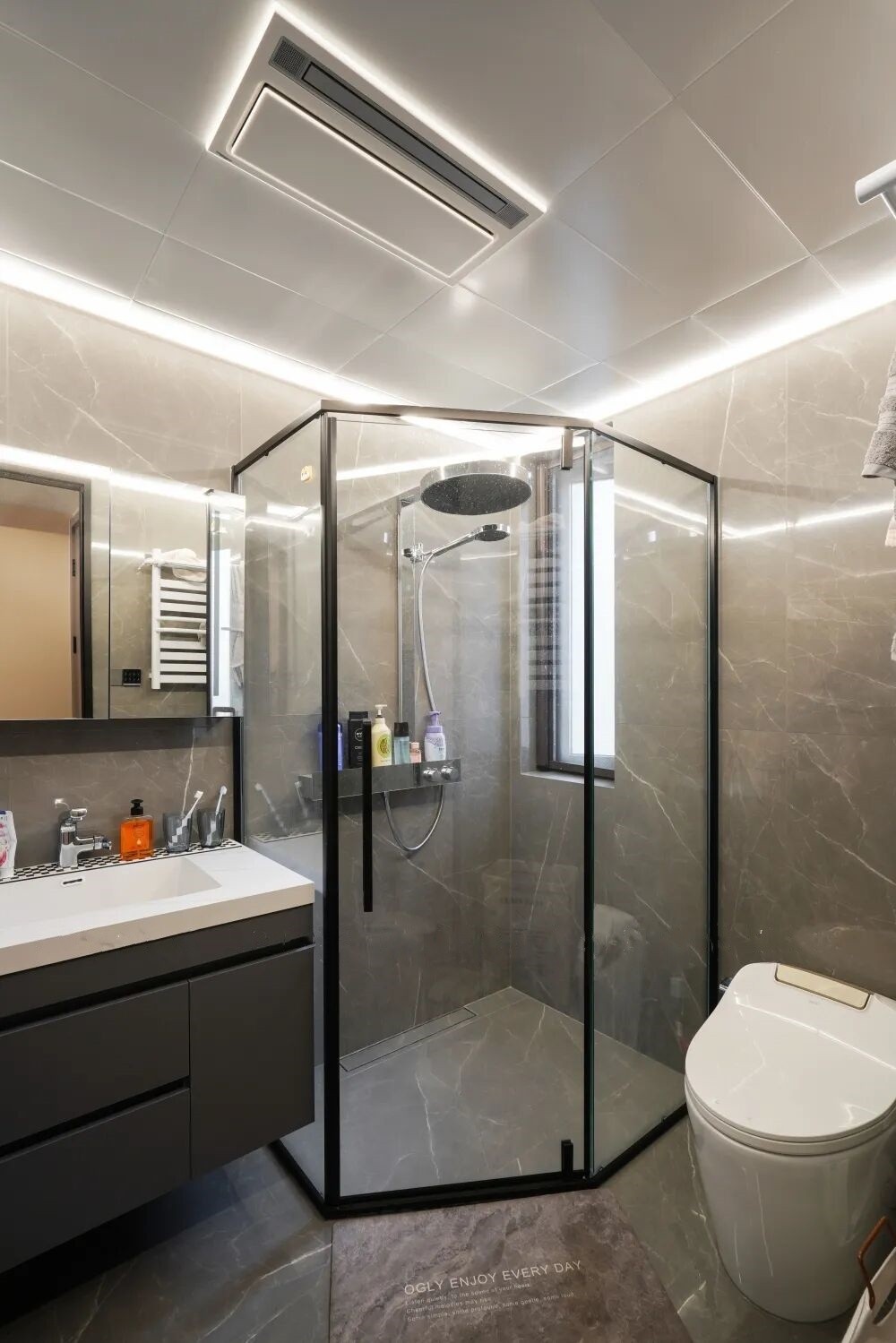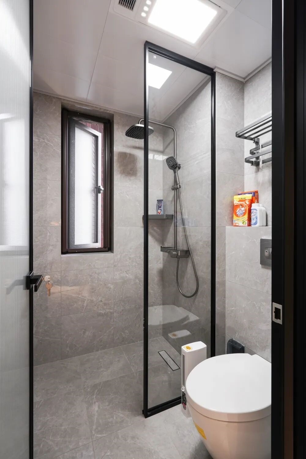主卧附带的卫生间,缓解家里卫生间使用的紧张情况,因为面积很小,所以选择钻石淋浴房。主卫大砖通铺对缝,颜色协调统一。