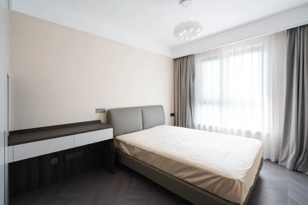 次卧延续主卧的风格,米白色的墙面搭配灰色的布帘,温馨时尚。