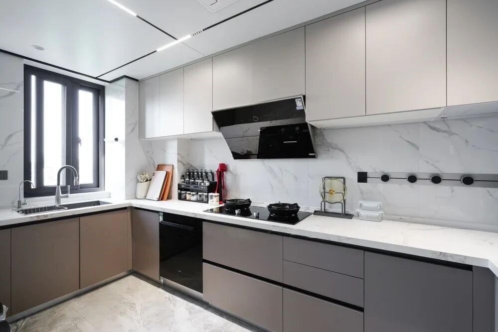 白色大理石岩板台面配合大板瓷砖的墙面,顶面是蜂窝板灯带,嵌入式洗碗机,厨房空间充分利用并且色彩搭配更协调合理。