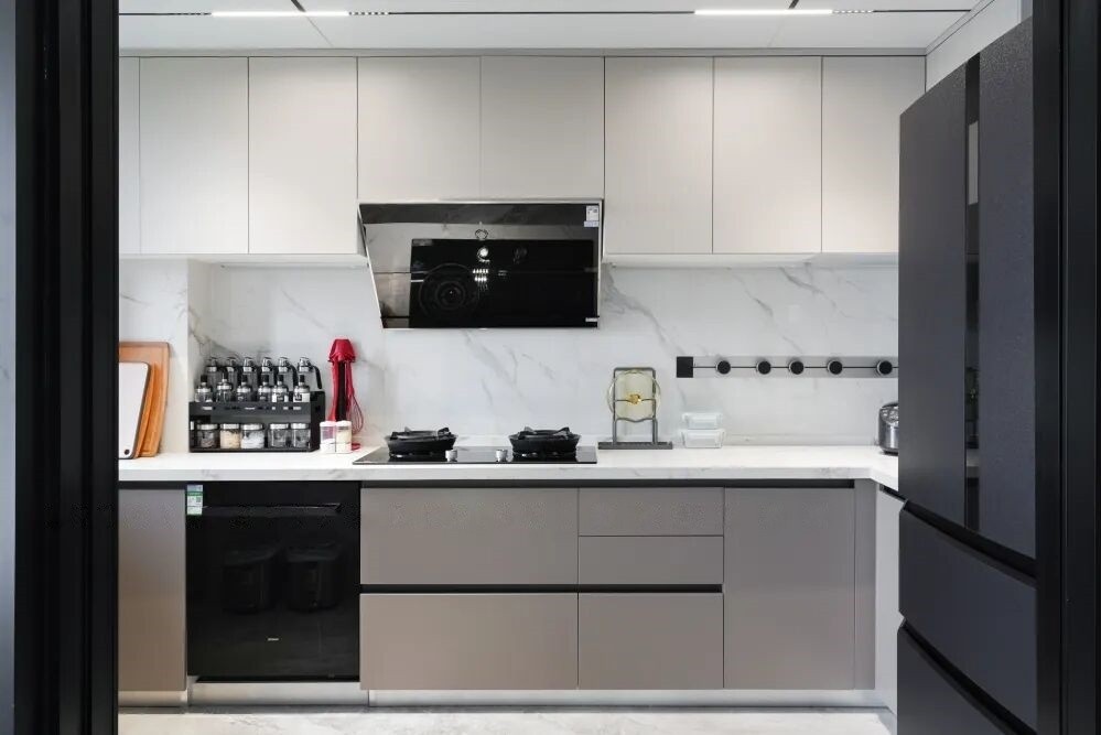增加了厨房的入口尺寸,做了三联动移门,吊轨门方便清理打扫,还很美观。把900的大双门冰箱放在厨房里也不显得局促。