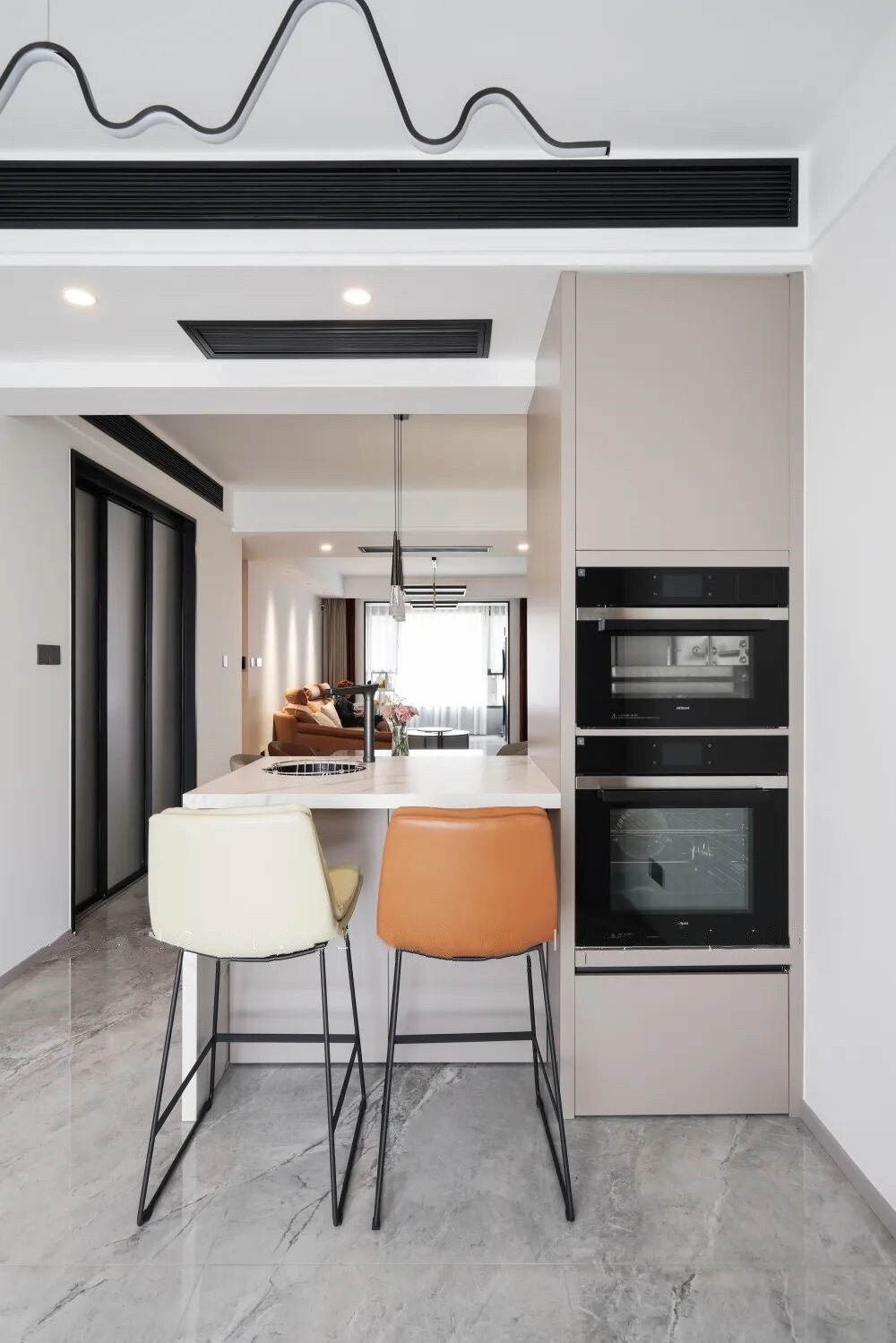 嵌入式蒸烤箱与岛台融合到一起,可以隐藏柱体,增加空间使用率,背面是木格栅做装饰,增加餐厅的精致。