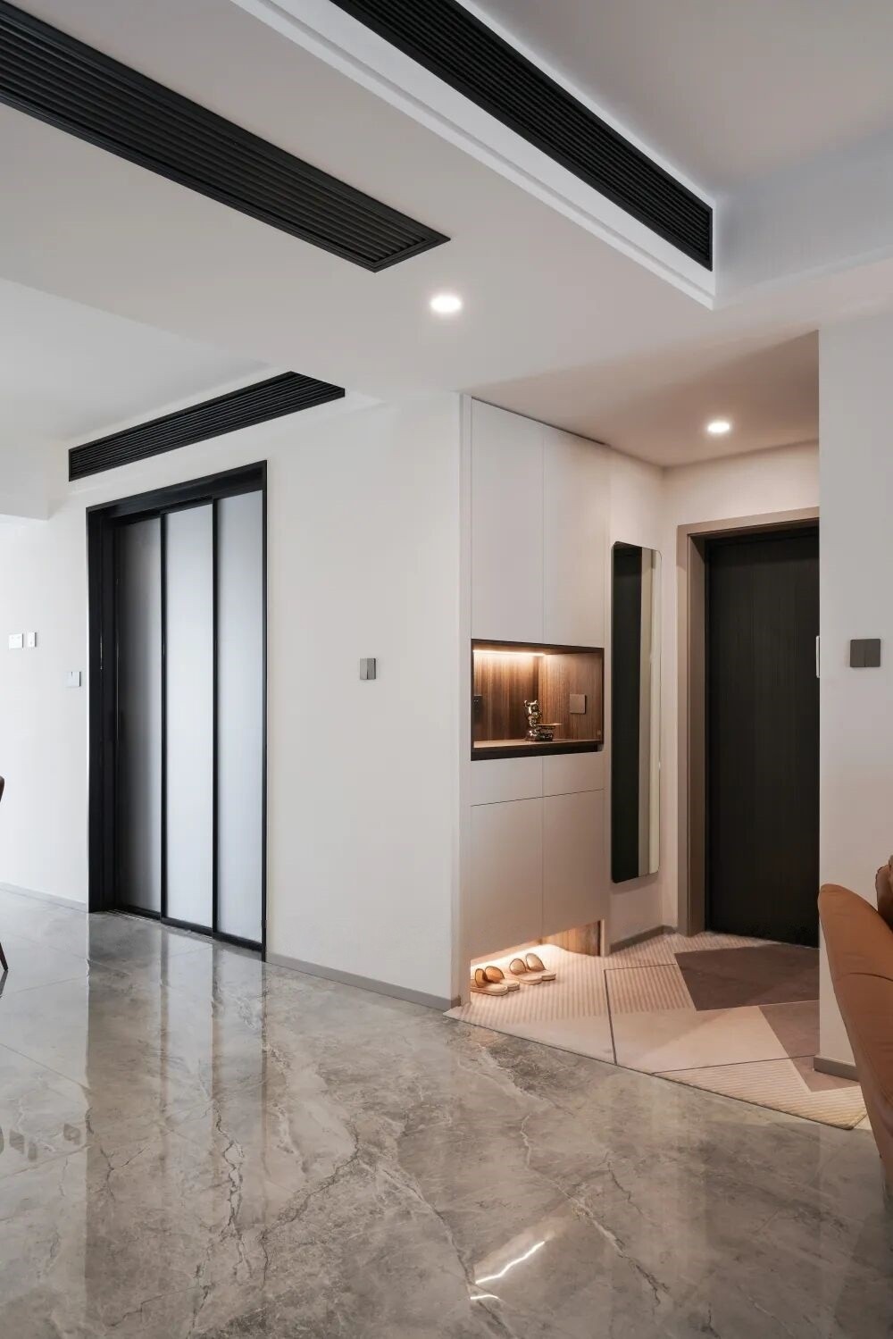 嵌入式玄关柜,中部及下部镂空方便换鞋和储存物品。有一面全身镜,方便进出整理自己衣着服饰。